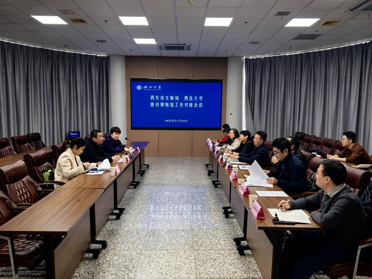 11月14日下午,西安市文物局党组成员、副局长冯健一行来我校,就唐诗博物馆建设工作开展调研座谈。会议由校党委副书记赵作纽主持。市文物局博物馆与社会文物处处长刘夏盈和相关负责人,我校博物馆、中国文化研究中心、社科处、国资处、图书馆负责人参加调研座谈。