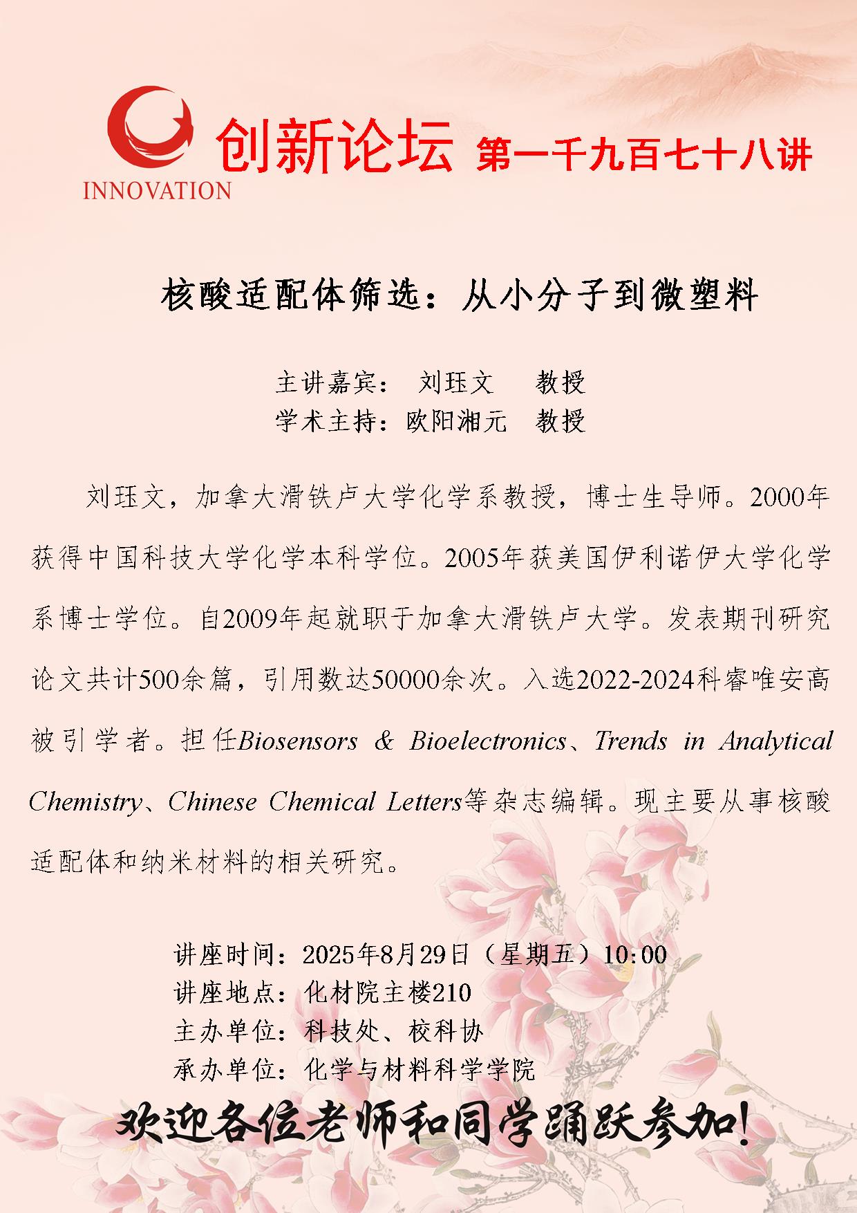 刘珏文 教授 国产精品九九久久一区hh创新论坛第一千九百七十八讲:核酸适配体筛选:从小分子到微塑料 讲座时间 2025年8月29日(星期五)10:00 讲座地点 化材院主楼210 讲座人介绍 刘珏文 教授 讲座内容