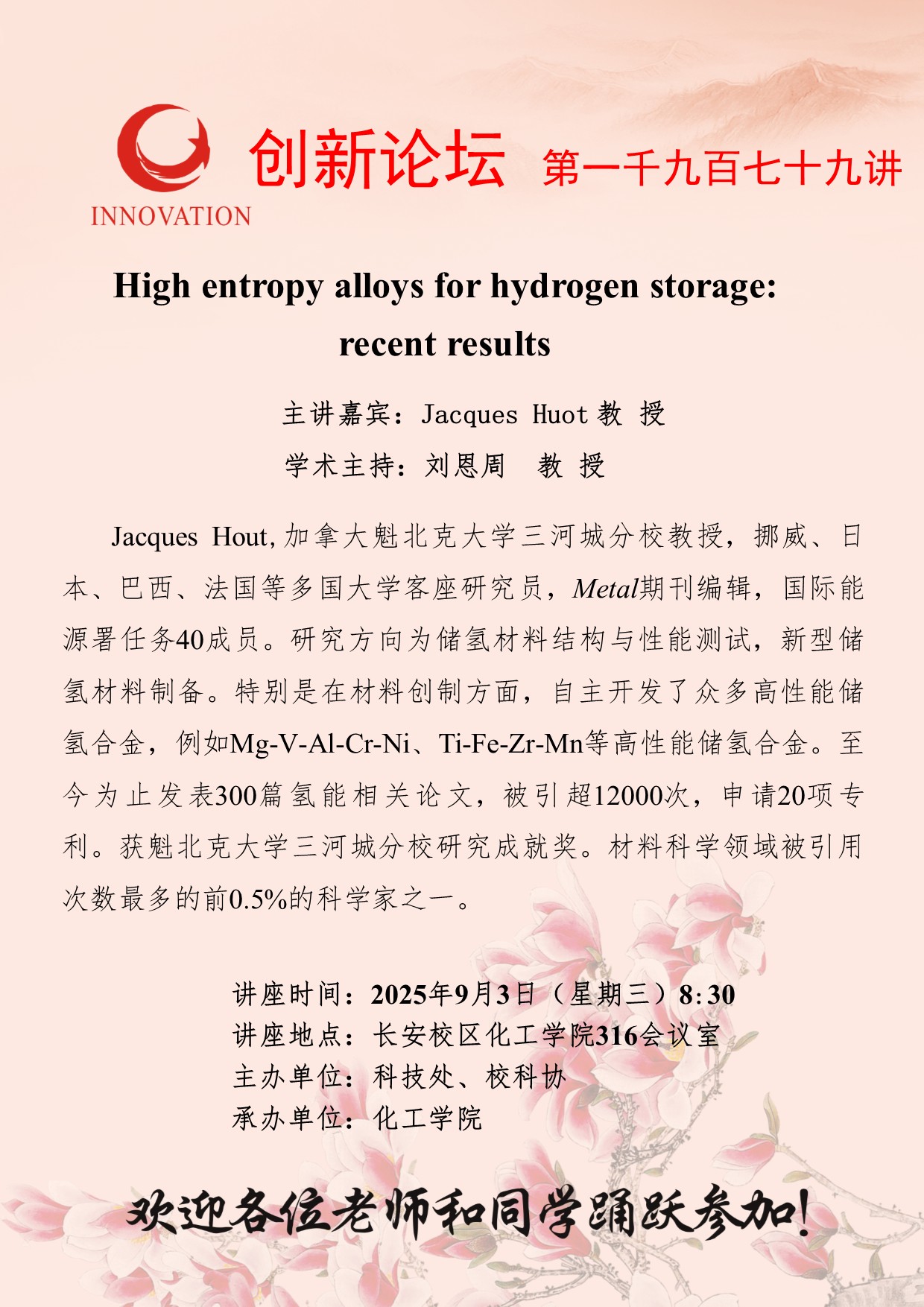Jacques Huot 教授 国产精品九九久久一区hh创新论坛第一千九百七十九讲:High entropy alloys for hydrogen storage: recent results 讲座时间 2025年9月3日(星期三)8:30 讲座地点 长安校区化工学院316会议室 讲座人介绍 Jacques Huot 教授 讲座内容