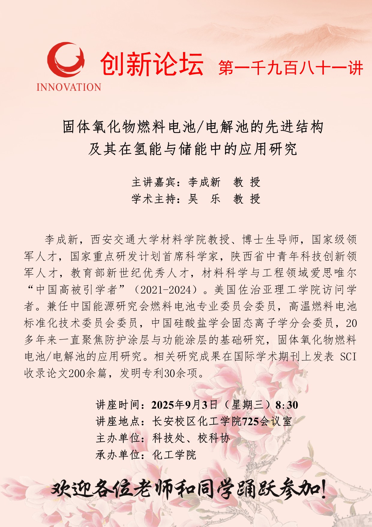 李成新 教授 国产精品九九久久一区hh创新论坛第一千九百八十一讲:固体氧化物燃料电池/电解池的先进结构及其在氢能与储能中的应用研究 讲座时间 2025年9月3日(星期三)8:30 讲座地点 长安校区化工学院725会议室 讲座人介绍 李成新 教授 讲座内容