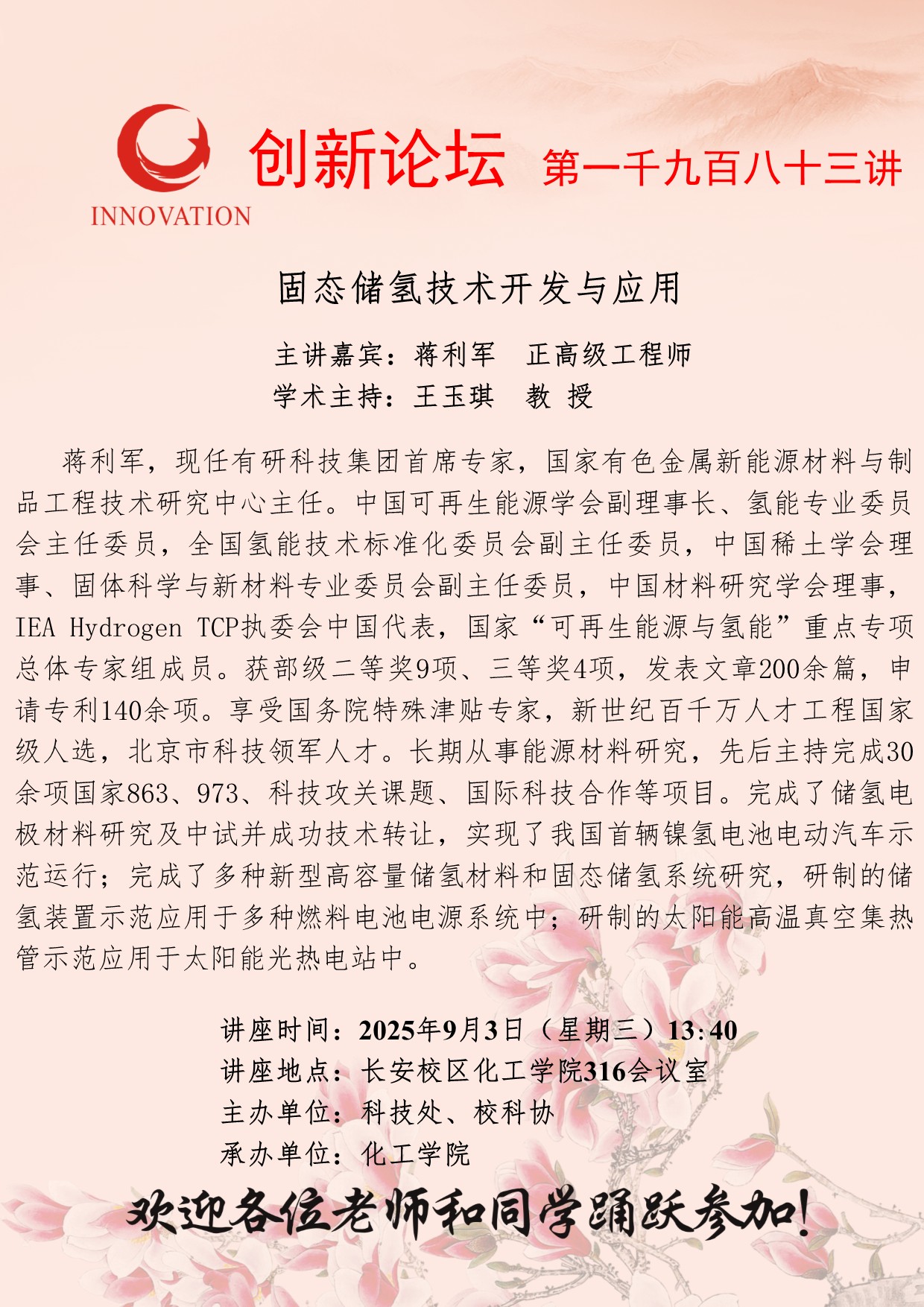 蒋利军 正高级工程师 国产精品九九久久一区hh创新论坛第一千九百八十三讲:固态储氢技术开发与应用 讲座时间 2025年9月3日(星期三)13:40 讲座地点 长安校区化工学院316会议室 讲座人介绍 蒋利军 正高级工程师 讲座内容