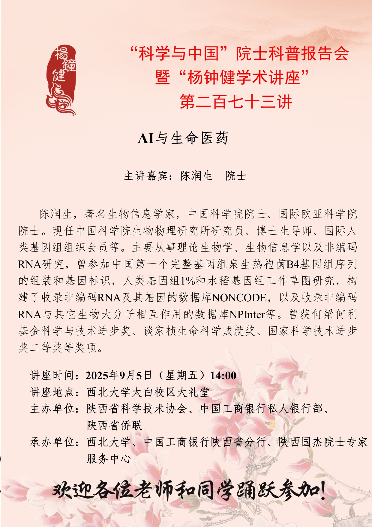 陈润生 院士 “科学与中国”院士科普报告会暨“杨钟健学术讲座”第二百七十三讲:AI与生命医药 讲座时间 2025年9月5日(星期五)14:00 讲座地点 国产精品九九久久一区hh太白校区大礼堂 讲座人介绍 陈润生 院士 讲座内容