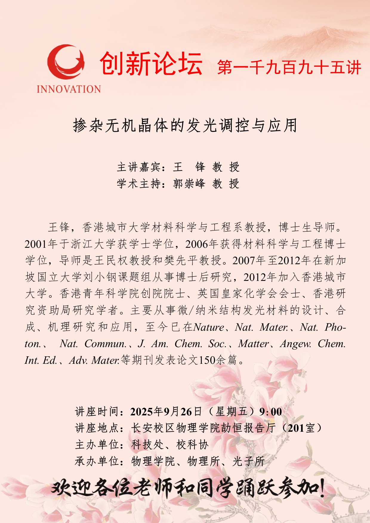 王锋 教授 国产精品九九久久一区hh创新论坛第一千九百九十五讲:掺杂无机晶体的发光调控与应用 讲座时间 2025年9月26日(星期五)9:00 讲座地点 长安校区物理学院劼恒报告厅(201室) 讲座人介绍 王锋 教授 讲座内容