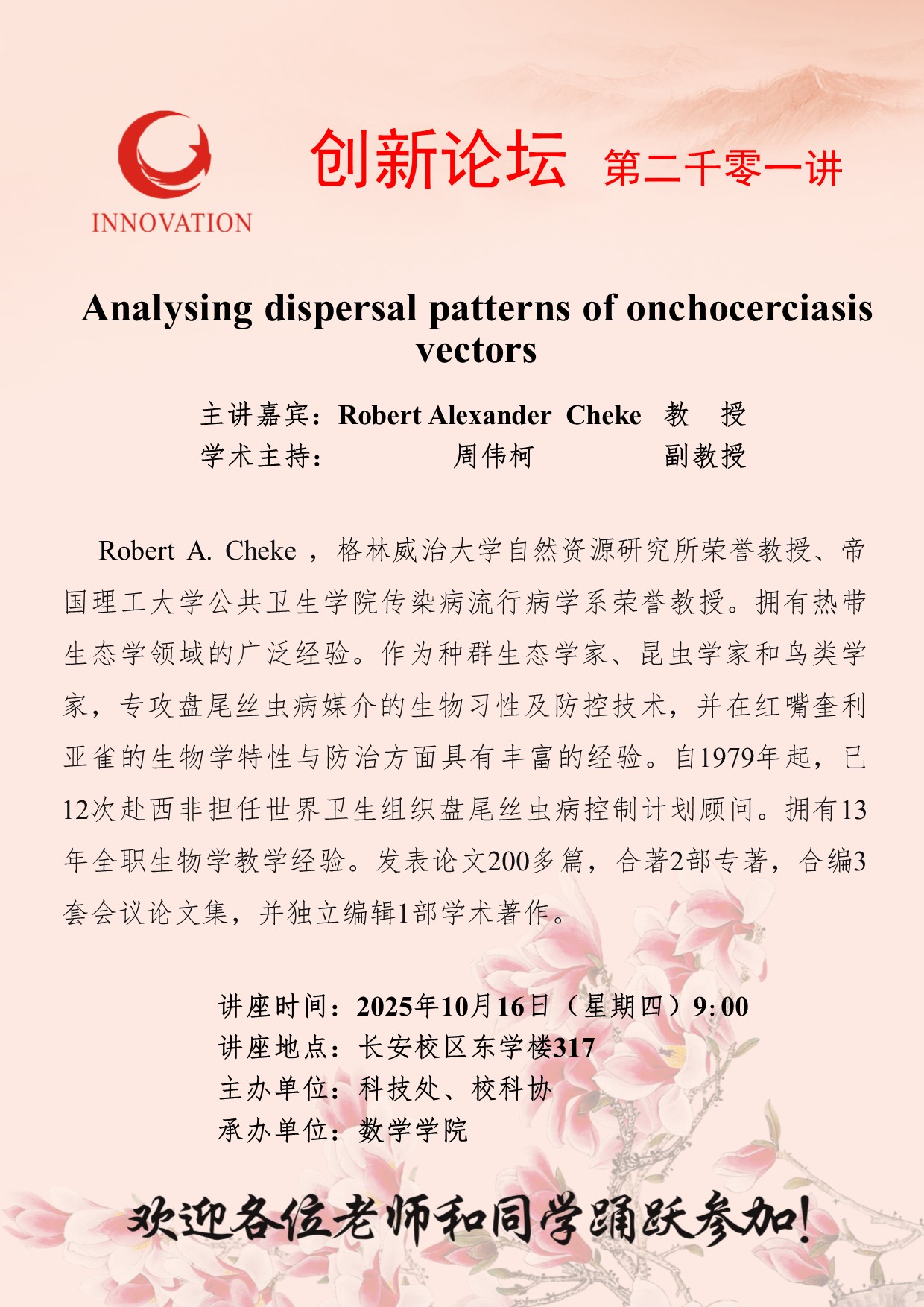 Robert Alexander Cheke 教授 国产精品九九久久一区hh创新论坛第二千零一讲:Analysing dispersal patterns of onchocerciasis vectors 讲座时间 2025年10月16日(星期四)9:00 讲座地点 长安校区东学楼317 讲座人介绍 Robert Alexander Cheke 教授 讲座内容