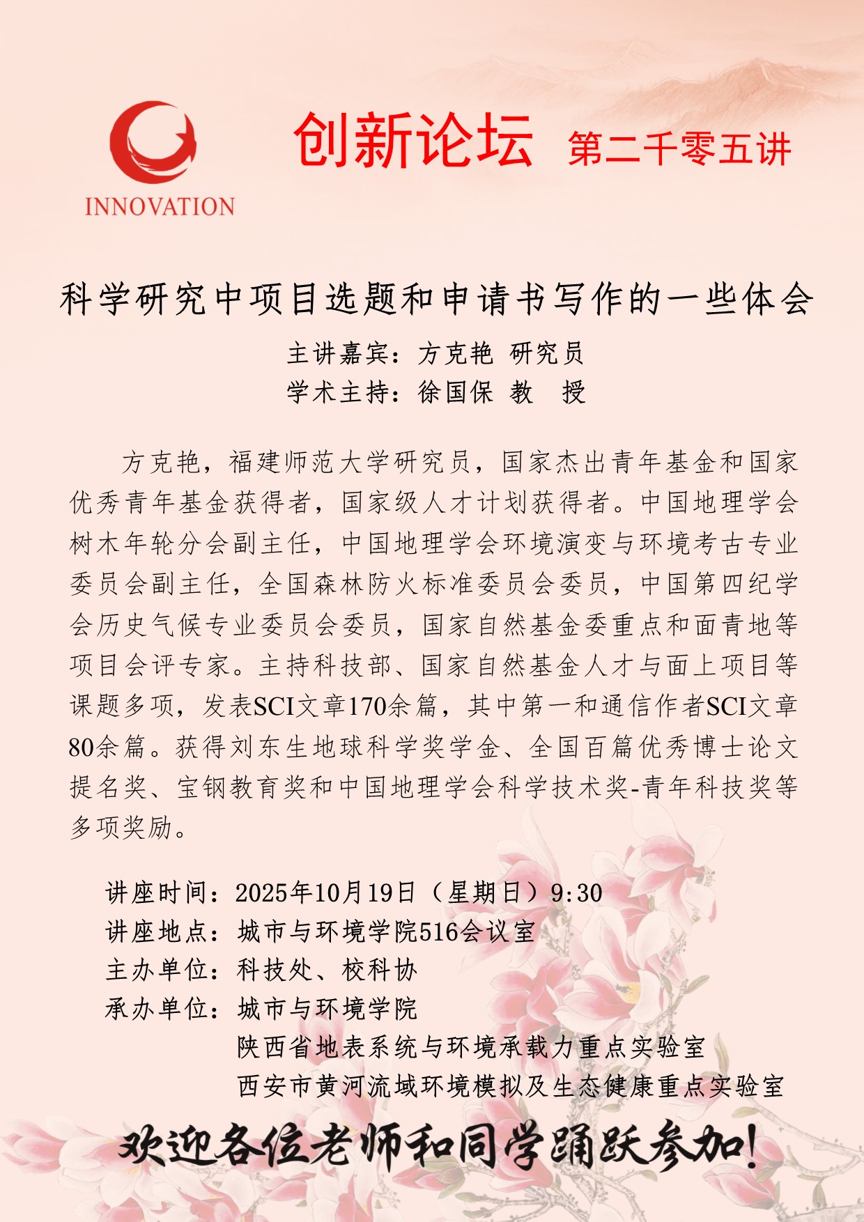 方克艳 研究员 国产精品九九久久一区hh创新论坛第二千零五讲:科学研究中项目选题和申请书写作的一些体会 讲座时间 2025年10月19日(星期日)9:30 讲座地点 城市与环境学院516会议室 讲座人介绍 方克艳 研究员 讲座内容