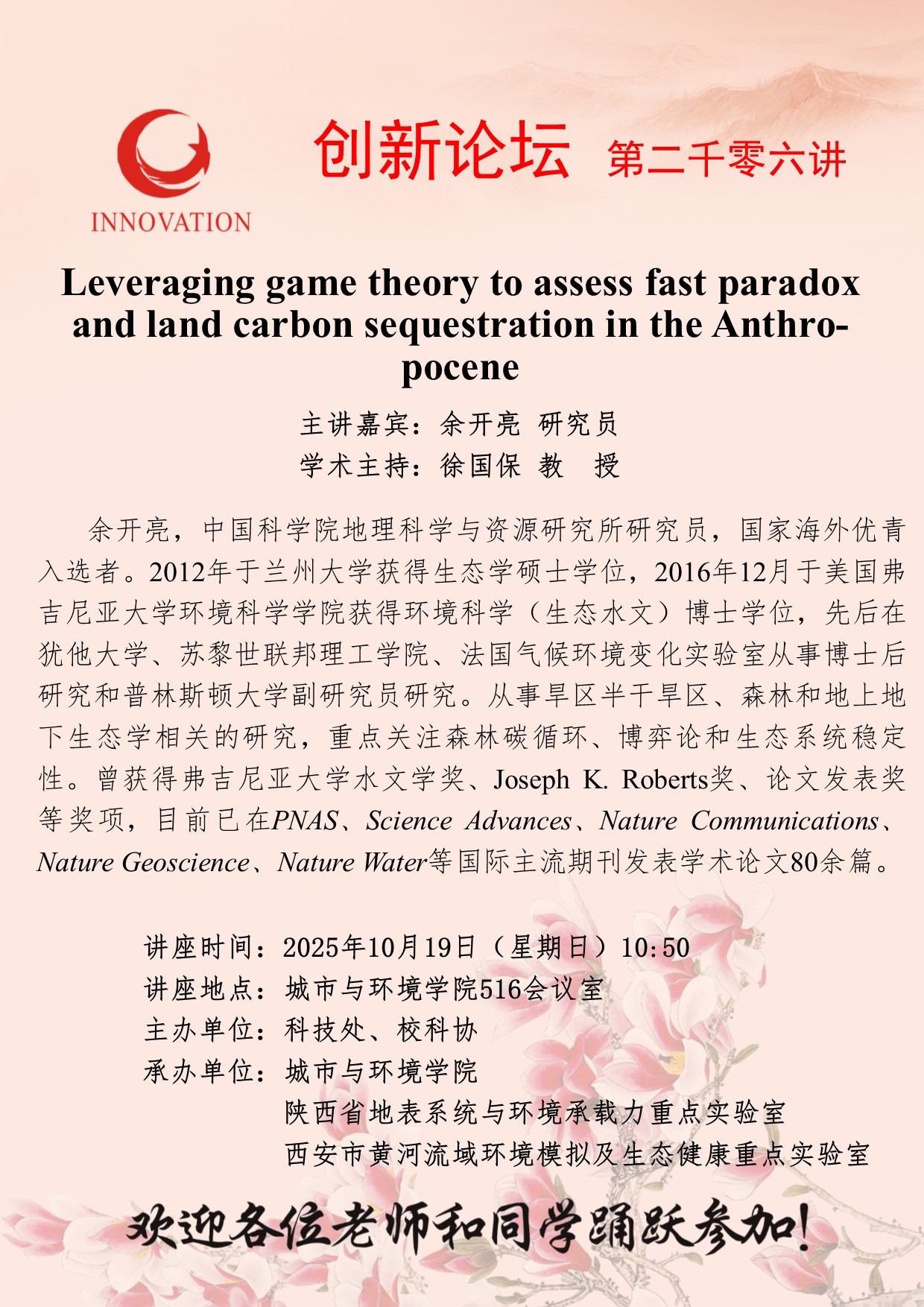 余开亮 研究员 国产精品九九久久一区hh创新论坛第二千零六讲:Leveraging game theory to assess fast paradoxand land carbon sequestration in the Anthro-pocene 讲座时间 2025年10月19日(星期日)10:50 讲座地点 城市与环境学院516会议室 讲座人介绍 余开亮 研究员 讲座内容