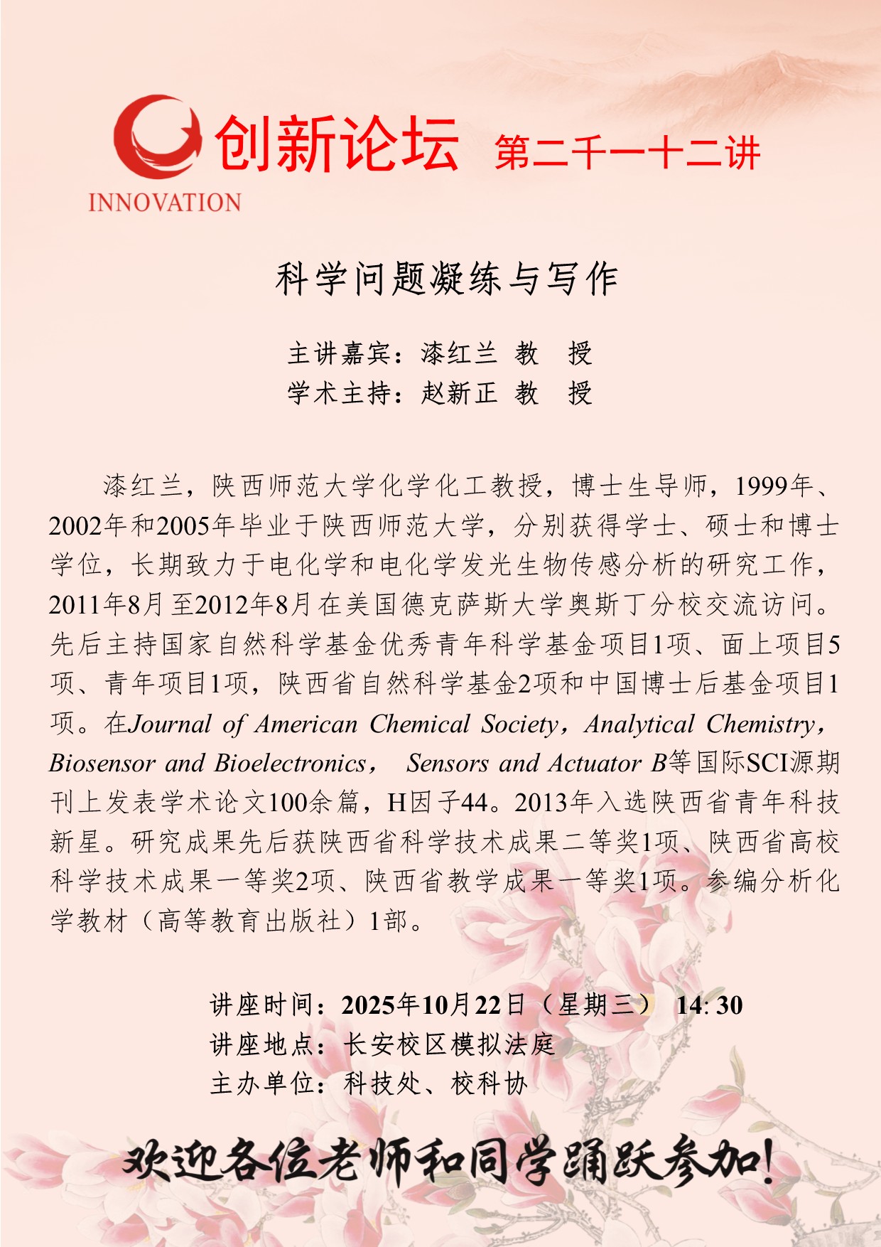 漆红兰 教 授 国产精品九九久久一区hh创新论坛第二千一十二讲:科学问题凝练与写作 讲座时间 2025年10月22日(星期三) 14: 30 讲座地点 长安校区模拟法庭 讲座人介绍 漆红兰 教 授 讲座内容
