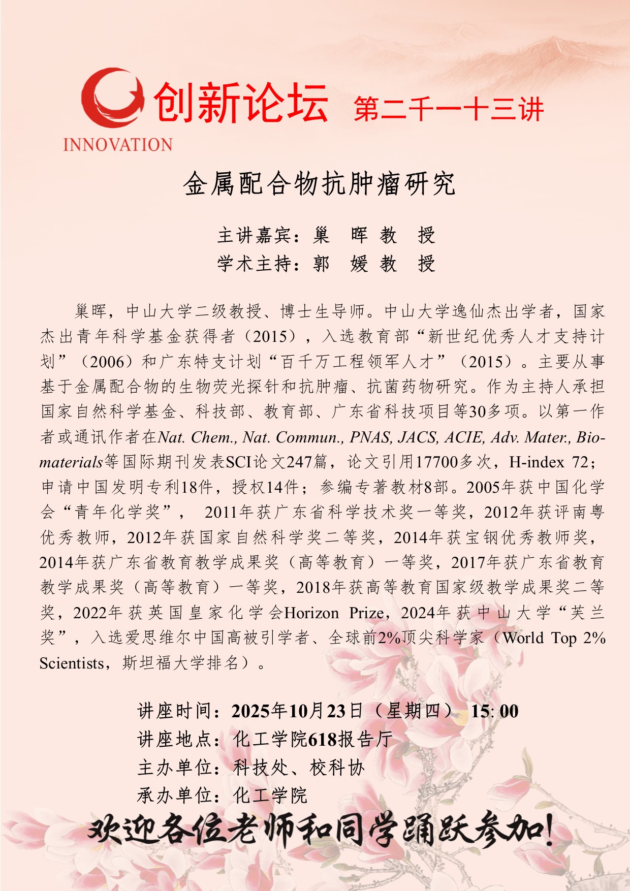 巢 晖 教 授 国产精品九九久久一区hh创新论坛第二千一十三讲:金属配合物抗肿瘤研究 讲座时间 2025年10月23日(星期四) 15: 00 讲座地点 化工学院618报告厅 讲座人介绍 巢 晖 教 授 讲座内容