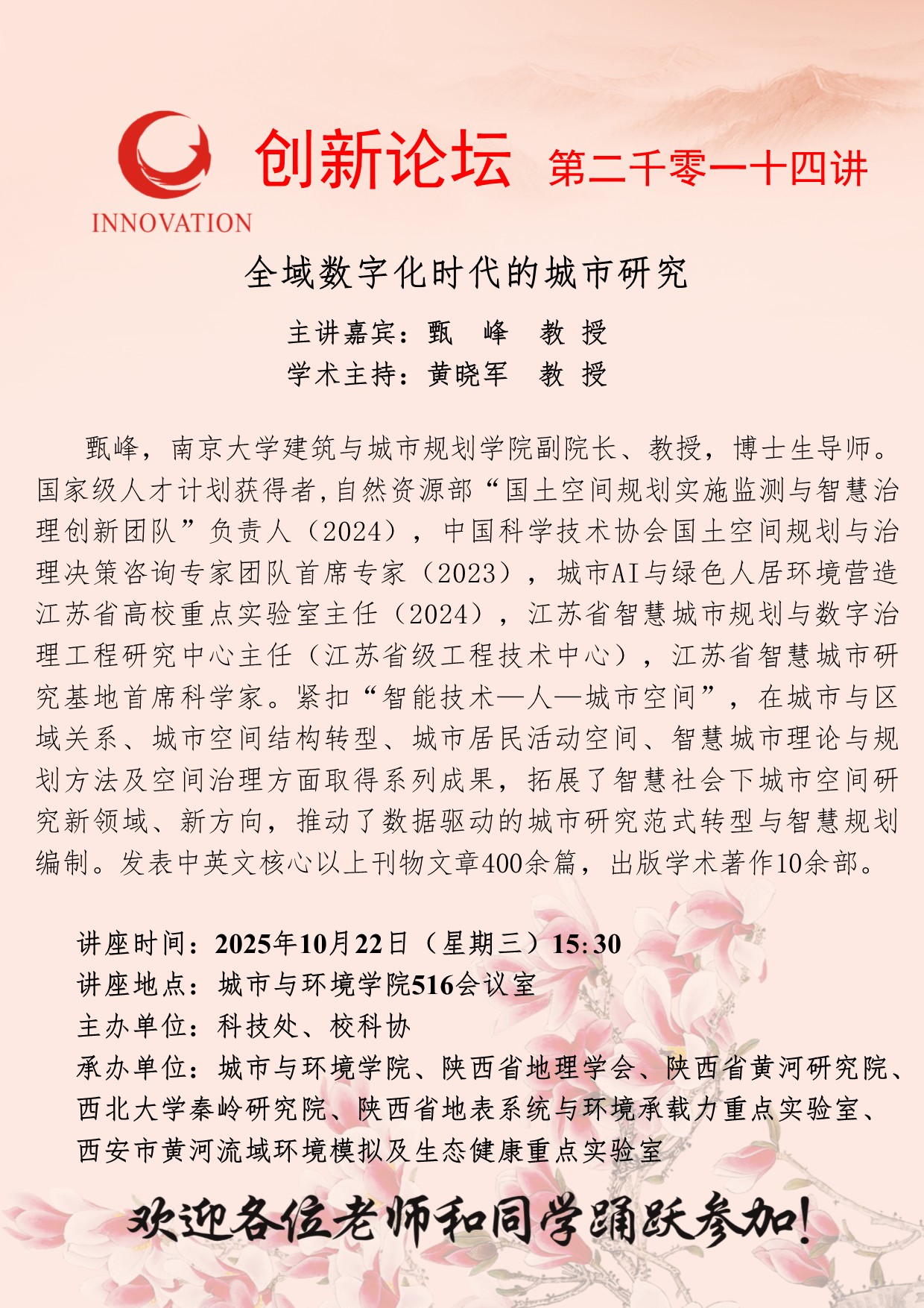 甄峰 教授 国产精品九九久久一区hh创新论坛第二千零一十四讲:全域数字化时代的城市研究 讲座时间 2025年10月22日(星期三)15:30 讲座地点 城市与环境学院516会议室 讲座人介绍 甄峰 教授 讲座内容