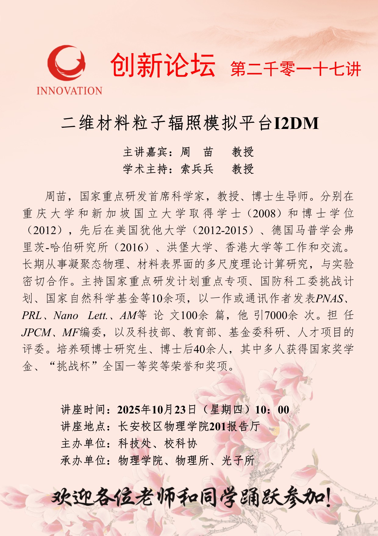 周苗 教授 国产精品九九久久一区hh创新论坛第二千零一十七讲:二维材料粒子辐照模拟平台I2DM 讲座时间 2025年10月23日(星期四)10:00 讲座地点 长安校区物理学院201报告厅 讲座人介绍 周苗 教授 讲座内容