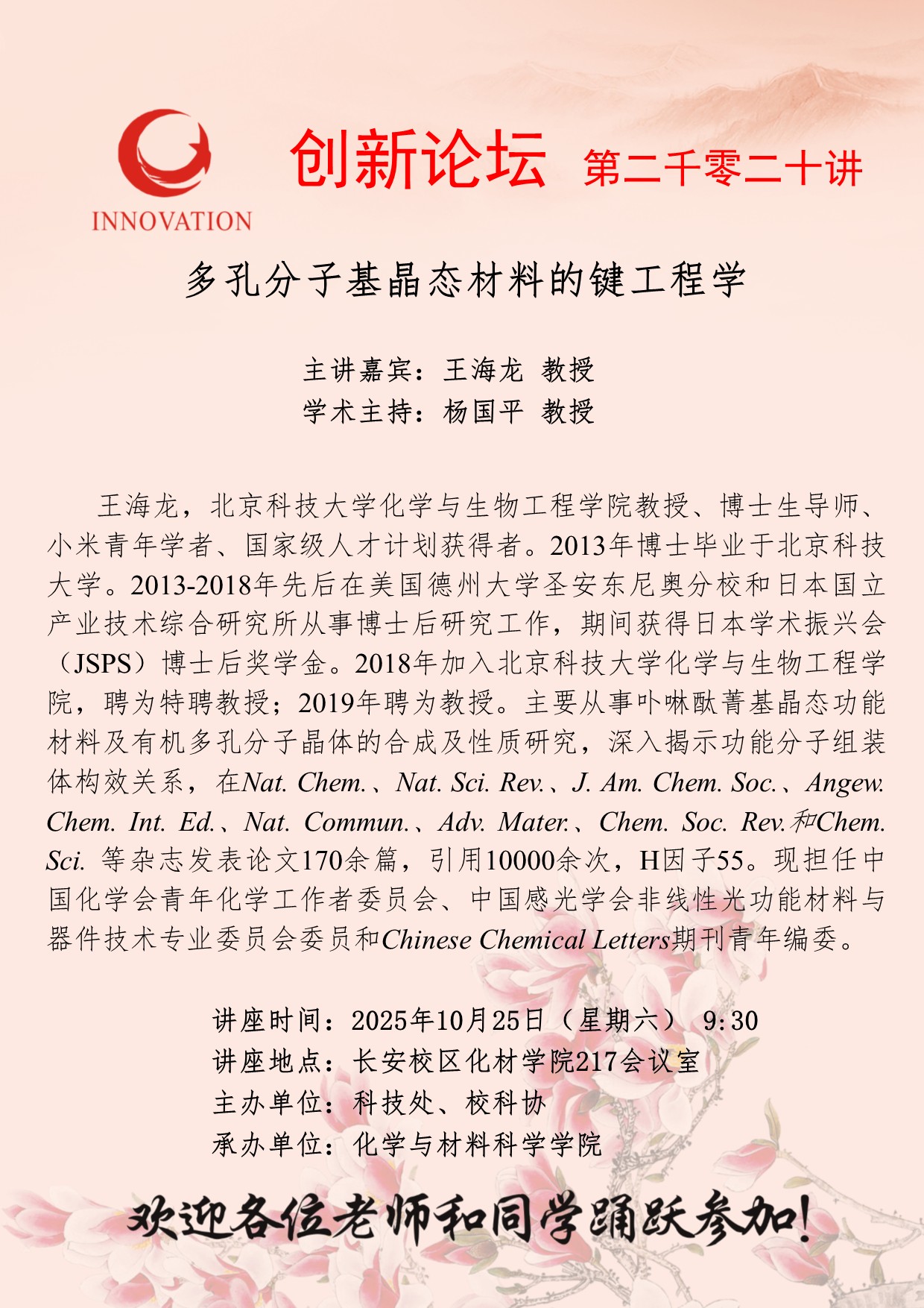 王海龙 教授 国产精品九九久久一区hh创新论坛第二千零二十讲:多孔分子基晶态材料的键工程学 讲座时间 2025年10月25日(星期六) 9:30 讲座地点 长安校区化材学院217会议室 讲座人介绍 王海龙 教授 讲座内容