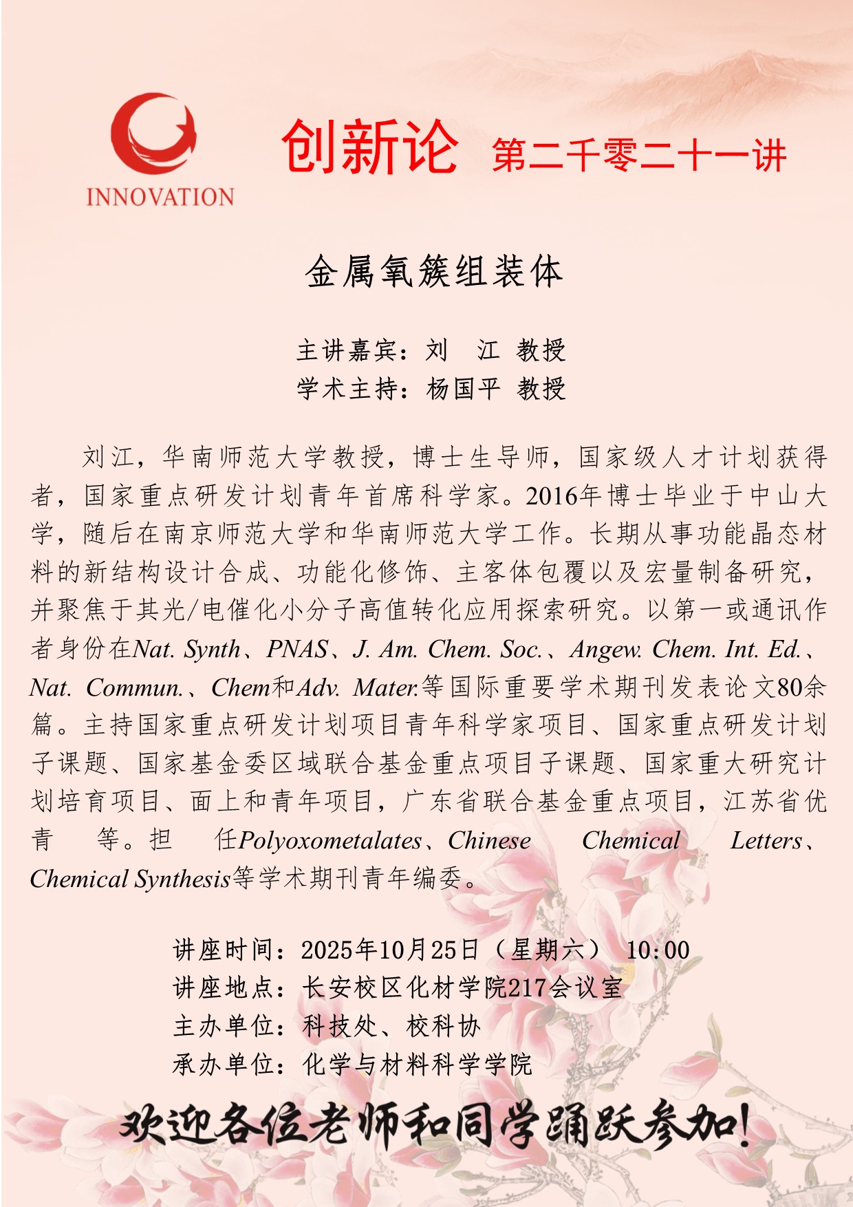 刘 江 教授 国产精品九九久久一区hh创新论坛第二千零二十一讲:金属氧簇组装体 讲座时间 2025年10月25日(星期六) 10:00 讲座地点 长安校区化材学院217会议室 讲座人介绍 刘 江 教授 讲座内容