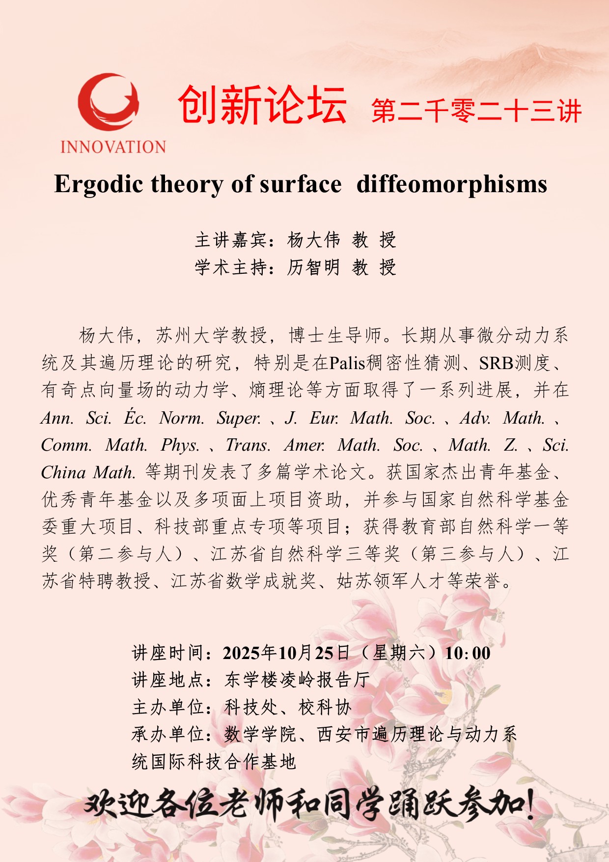 杨大伟 教 授 国产精品九九久久一区hh创新论坛第二千零二十三讲:Ergodic theory of surface diffeomorphisms 讲座时间 2025年10月25日(星期六)10:00 讲座地点 东学楼凌岭报告厅 讲座人介绍 杨大伟 教 授 讲座内容