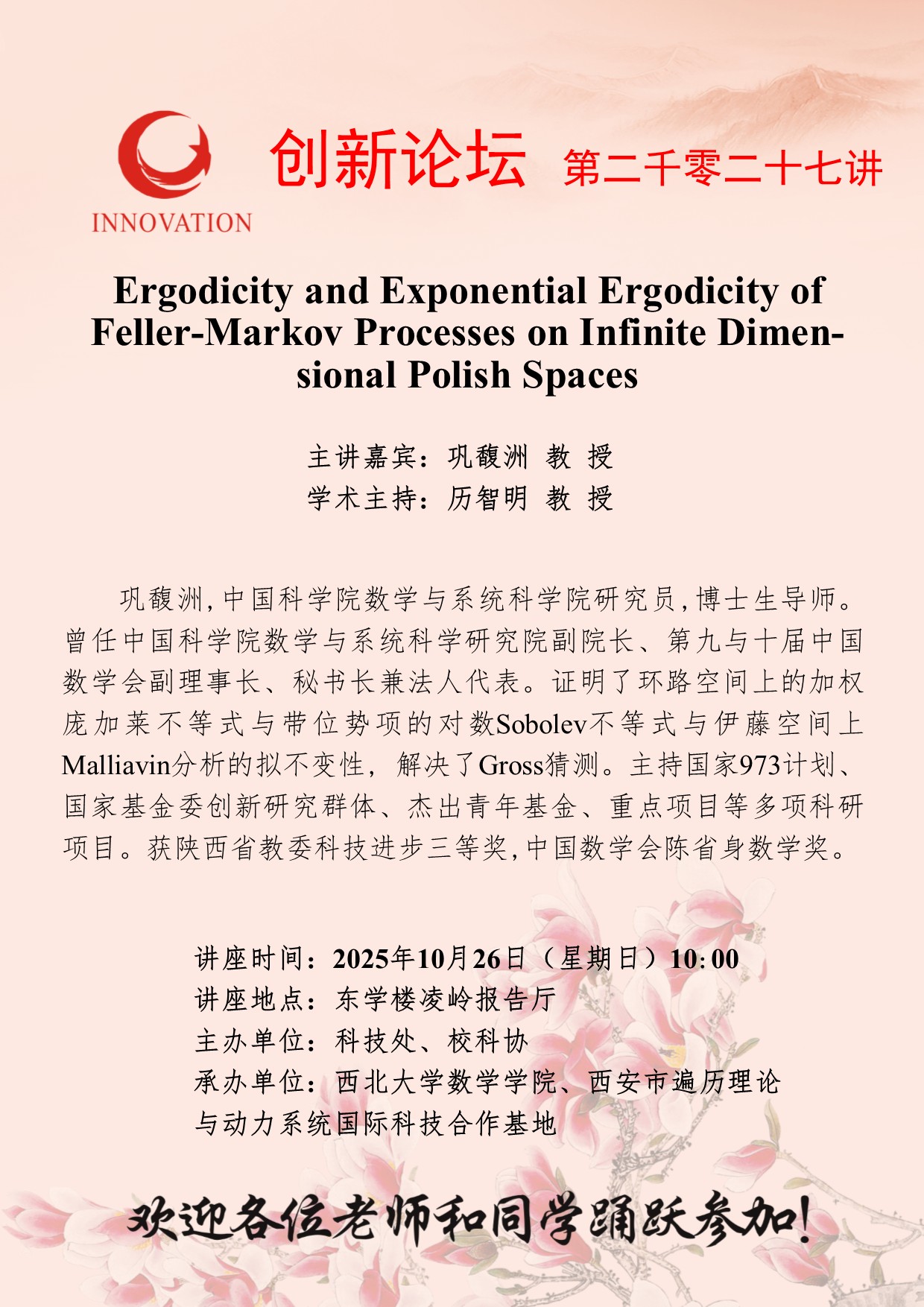 巩馥洲 教 授 国产精品九九久久一区hh创新论坛第二千零二十七讲:Ergodicity and Exponential Ergodicity of Feller-Markov Processes on Infinite Dimensional Polish Spaces 讲座时间 2025年10月26日(星期日)10:00 讲座地点 东学楼凌岭报告厅 讲座人介绍 巩馥洲 教 授 讲座内容
