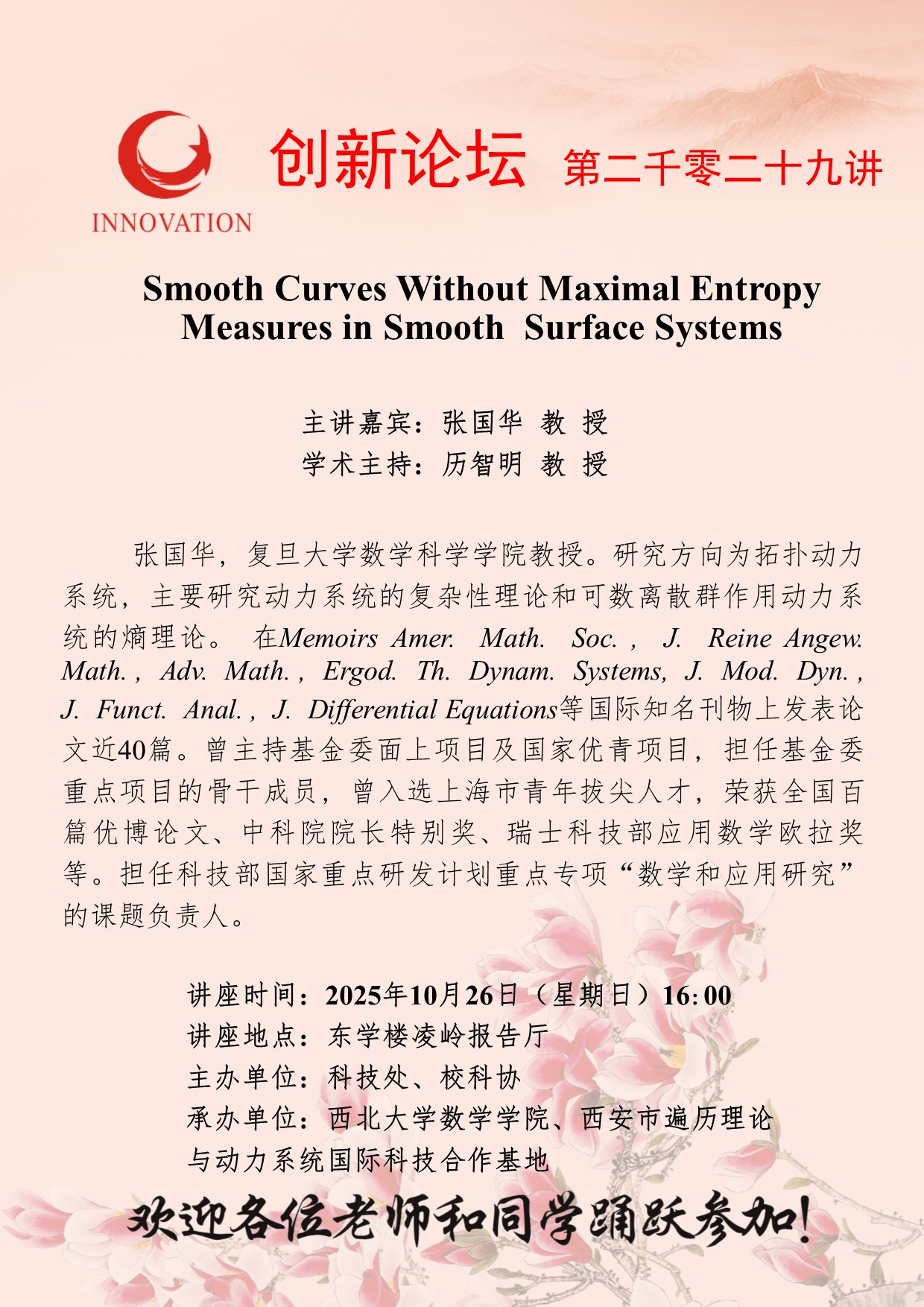 张国华 教 授 国产精品九九久久一区hh创新论坛第二千零二十九讲:Smooth Curves Without Maximal Entropy Measures in Smooth Surface Systems 讲座时间 2025年10月26日(星期日)16:00 讲座地点 东学楼凌岭报告厅 讲座人介绍 张国华 教 授 讲座内容