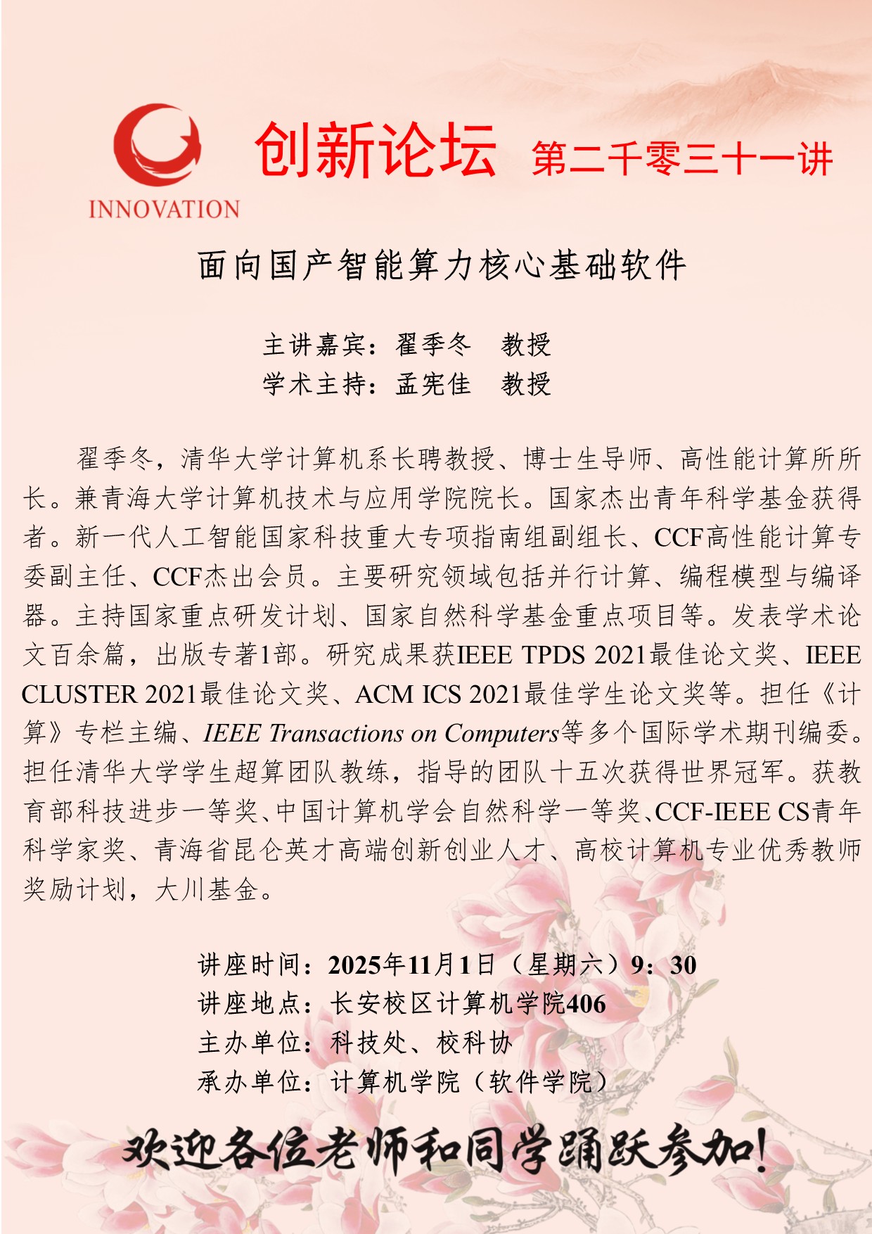 翟季冬 教授 国产精品九九久久一区hh创新论坛第二千零三十一讲:面向国产智能算力核心基础软件 讲座时间 2025年11月1日(星期六)9:30 讲座地点 长安校区计算机学院406 讲座人介绍 翟季冬 教授 讲座内容