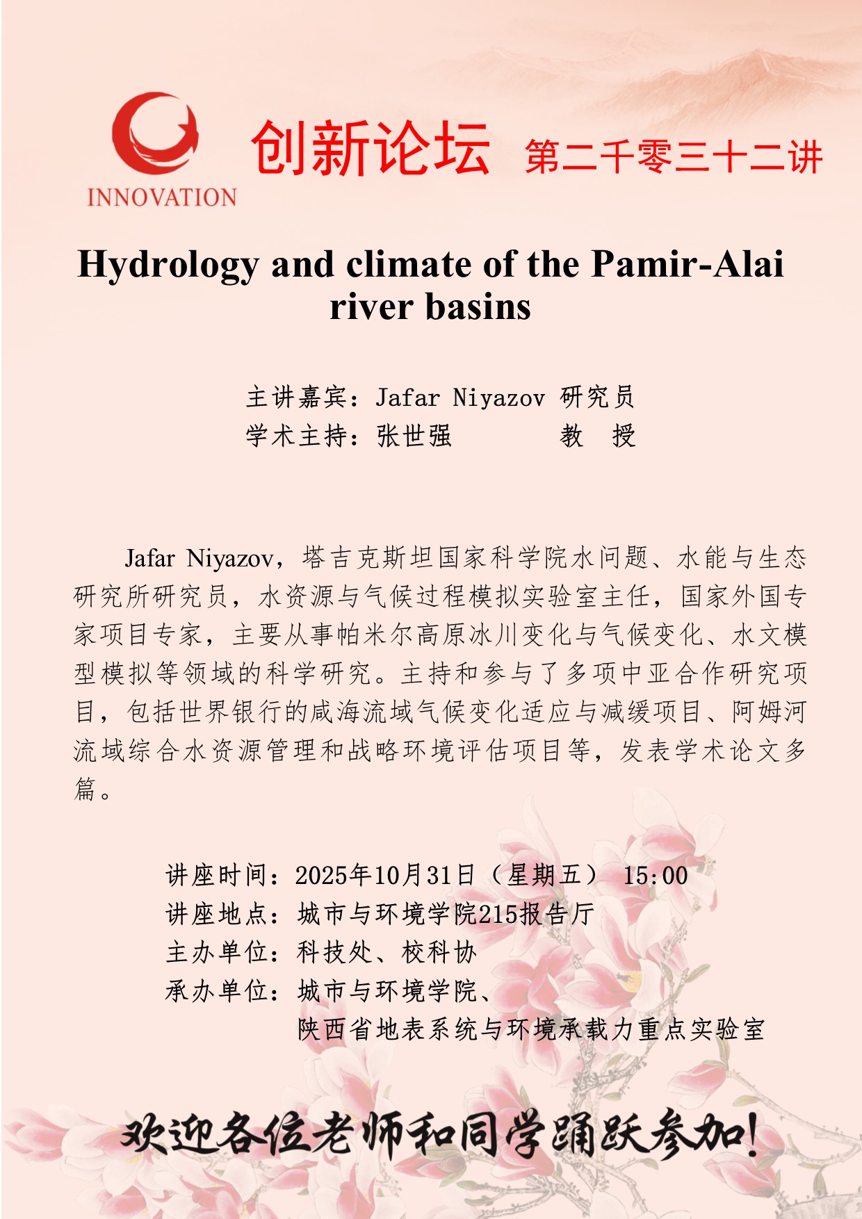 Jafar Niyazov 研究员 国产精品九九久久一区hh创新论坛第二千零三十二讲:Hydrology and climate of the Pamir-Alai river basins 讲座时间 2025年10月31日(星期五) 15:00 讲座地点 城市与环境学院215报告厅 讲座人介绍 Jafar Niyazov 研究员 讲座内容