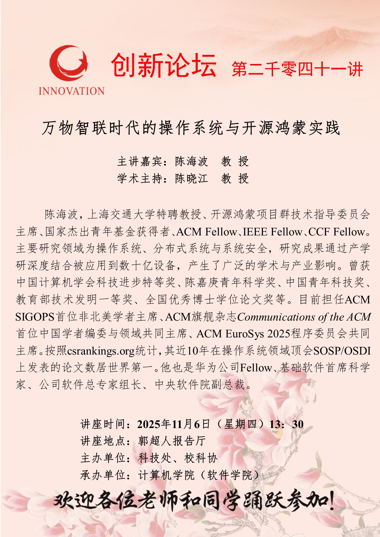 陈海波 教授 国产精品九九久久一区hh创新论坛第二千零四十一讲:万物智联时代的操作系统与开源鸿蒙实践 讲座时间 2025年11月6日(星期四)13:30 讲座地点 郭超人报告厅 讲座人介绍 陈海波 教授 讲座内容