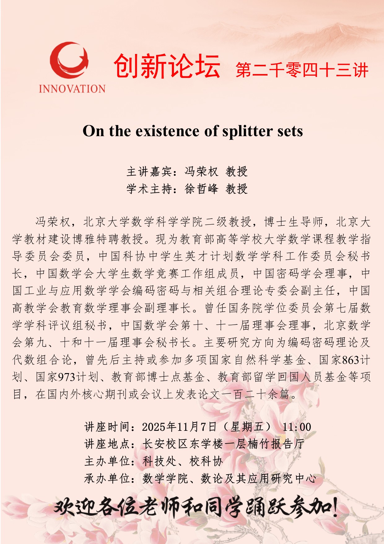 冯荣权 教授 国产精品九九久久一区hh创新论坛第二千零四十三讲:On the existence of splitter sets 讲座时间 2025年11月7日(星期五) 11:00 讲座地点 长安校区东学楼一层楠竹报告厅 讲座人介绍 冯荣权 教授 讲座内容