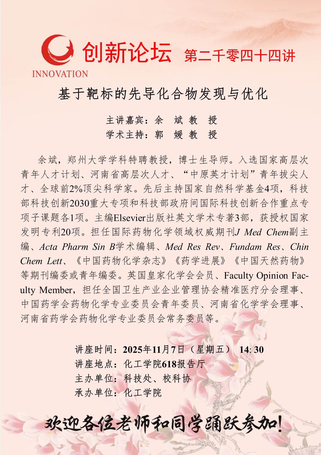 余斌 教授 国产精品九九久久一区hh创新论坛第二千零四十四讲:基于靶标的先导化合物发现与优化 讲座时间 2025年11月7日(星期五) 14: 30 讲座地点 化工学院618报告厅 讲座人介绍 余斌 教授 讲座内容
