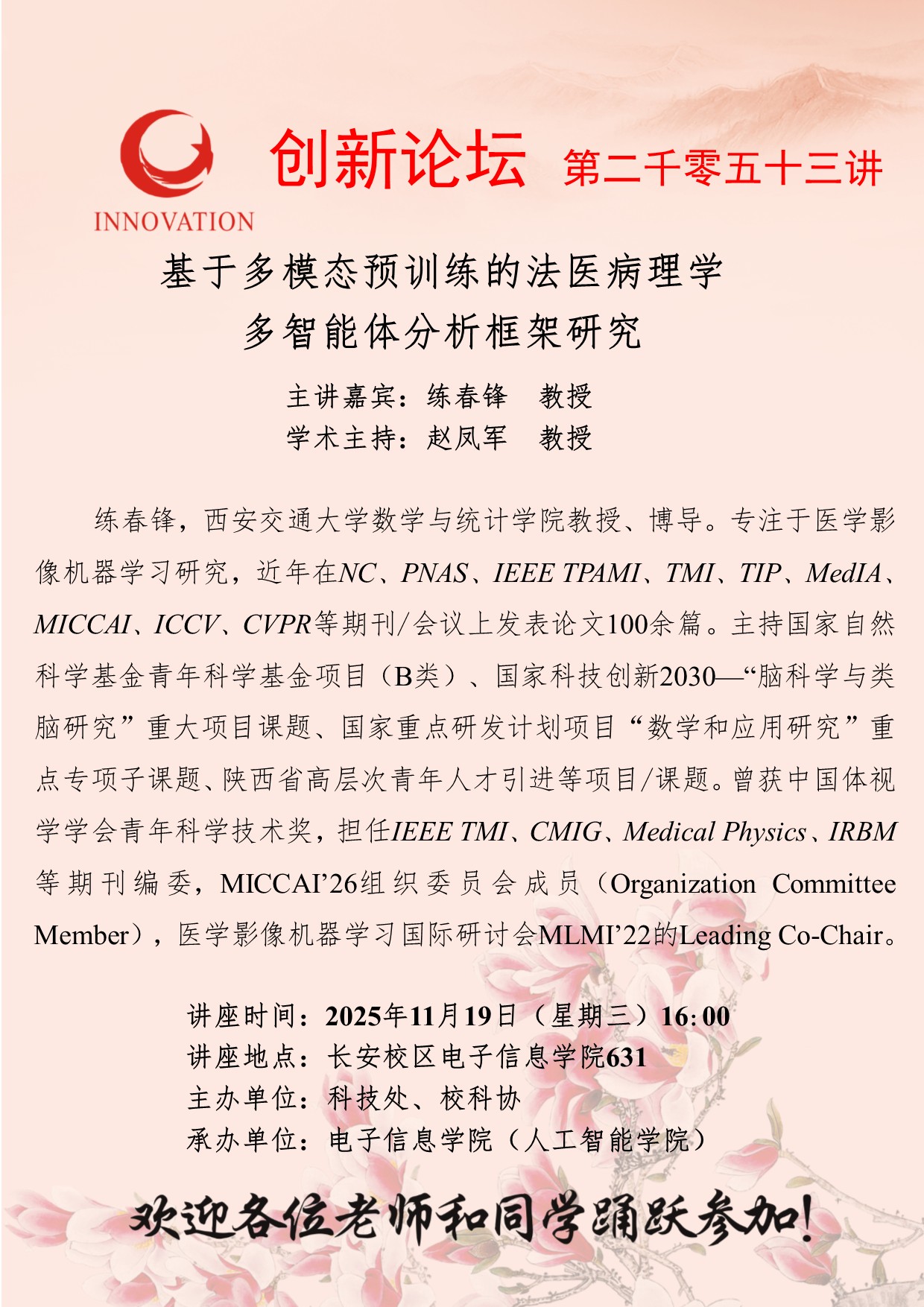 练春锋 教授 国产精品九九久久一区hh创新论坛第二千零五十三讲:基于多模态预训练的法医病理学多智能体分析框架研究 讲座时间 2025年11月19日(星期三)16:00 讲座地点 长安校区电子信息学院631 讲座人介绍 练春锋 教授 讲座内容