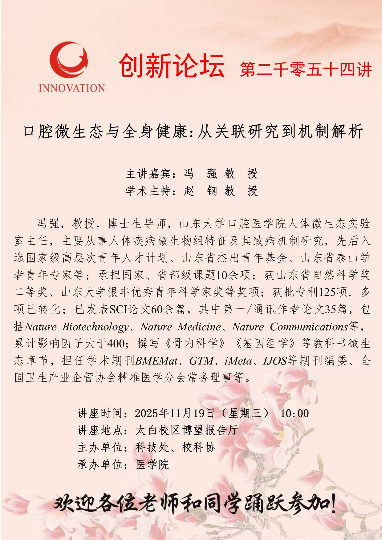 冯强 教授 国产精品九九久久一区hh创新论坛第二千零五十四讲:口腔微生态与全身健康:从关联研究到机制解析 讲座时间 2025年11月19日(星期三) 10:00 讲座地点 太白校区博望报告厅 讲座人介绍 冯强 教授 讲座内容