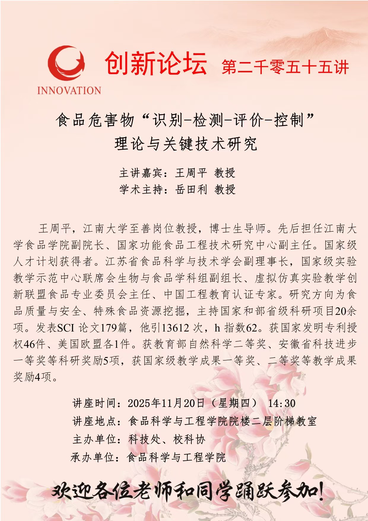 王周平 教授 国产精品九九久久一区hh创新论坛第二千零五十五讲:食品危害物“识别-检测-评价-控制”理论与关键技术研究 讲座时间 2025年11月20日(星期四) 14:30 讲座地点 食品科学与工程学院院楼二层阶梯教室 讲座人介绍 王周平 教授 讲座内容