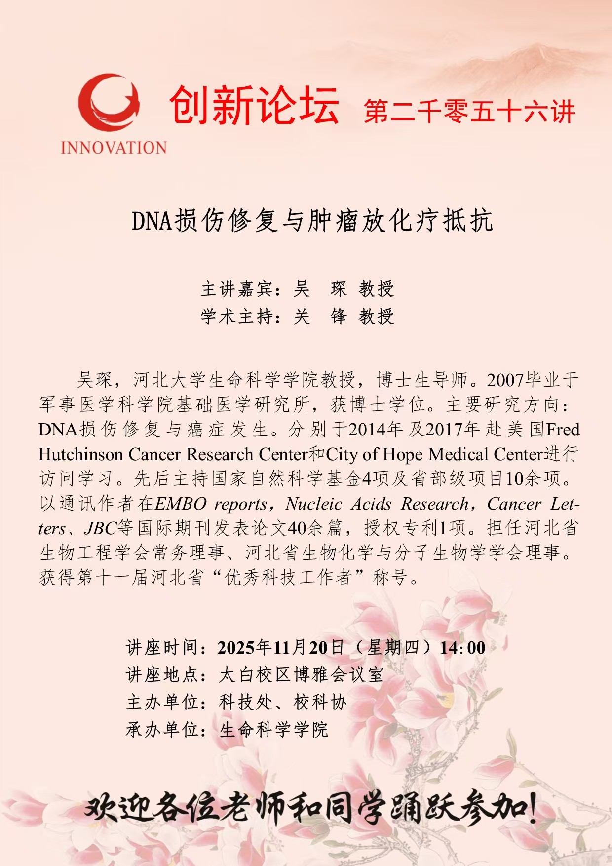 吴琛 教授 国产精品九九久久一区hh创新论坛第二千零五十六讲:DNA损伤修复与肿瘤放化疗抵抗 讲座时间 2025年11月20日(星期四)14:00 讲座地点 太白校区博雅会议室 讲座人介绍 吴琛 教授 讲座内容