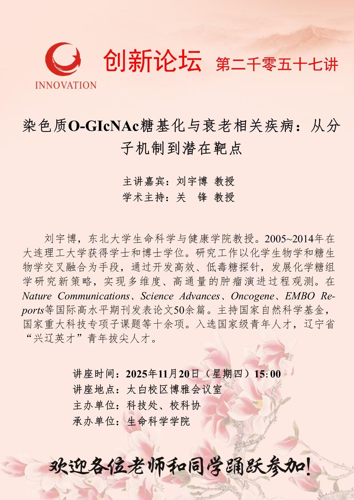 刘宇博 教授 国产精品九九久久一区hh创新论坛第二千零五十七讲:染色质O-GIcNAc糖基化与衰老相关疾病:从分子机制到潜在靶点 讲座时间 2025年11月20日(星期四)15:00 讲座地点 太白校区博雅会议室 讲座人介绍 刘宇博 教授 讲座内容
