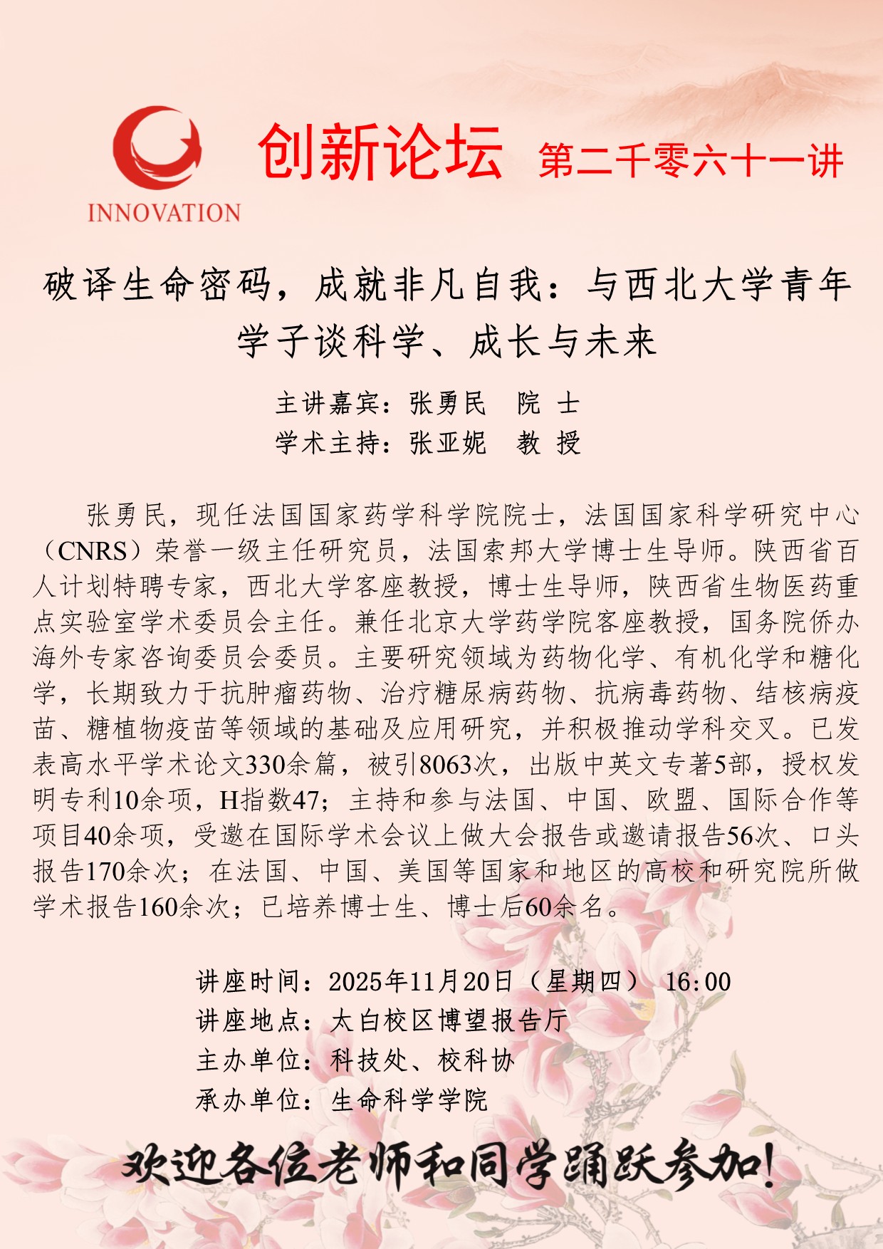 张勇民 院士 国产精品九九久久一区hh创新论坛第二千零六十一讲:破译生命密码,成就非凡自我:与国产精品九九久久一区hh青年学子谈科学、成长与未来 讲座时间 2025年11月20日(星期四) 16:00 讲座地点 太白校区博望报告厅 讲座人介绍 张勇民 院士 讲座内容