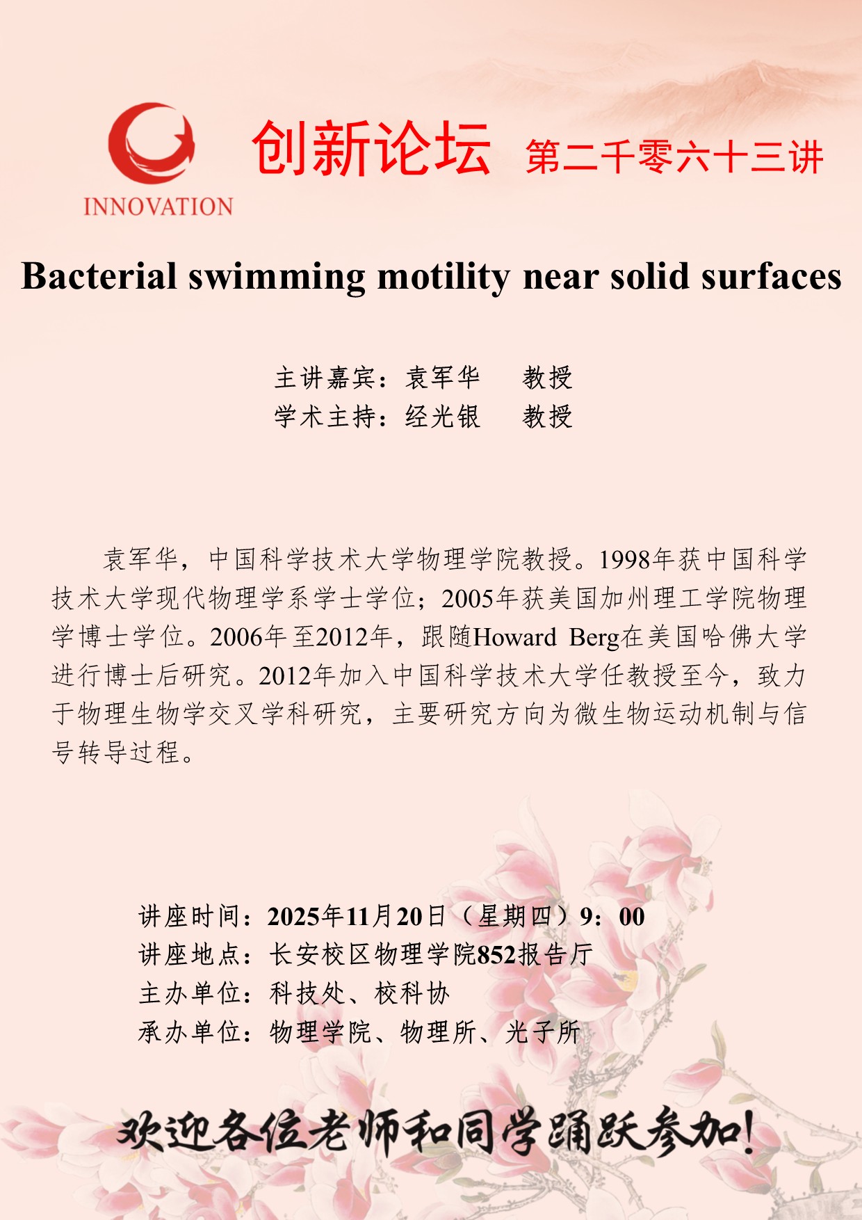 袁军华 教授 国产精品九九久久一区hh创新论坛第二千零六十三讲:Bacterial swimming motility near solid surfaces 讲座时间 2025年11月20日(星期四)9:00 讲座地点 长安校区物理学院852报告厅 讲座人介绍 袁军华 教授 讲座内容