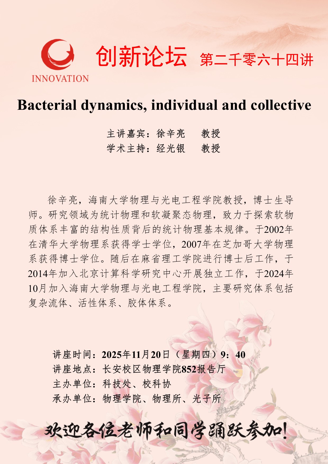徐辛亮 教授 国产精品九九久久一区hh创新论坛第二千零六十四讲:Bacterial dynamics, individual and collective 讲座时间 2025年11月20日(星期四)9:40 讲座地点 长安校区物理学院852报告厅 讲座人介绍 徐辛亮 教授 讲座内容
