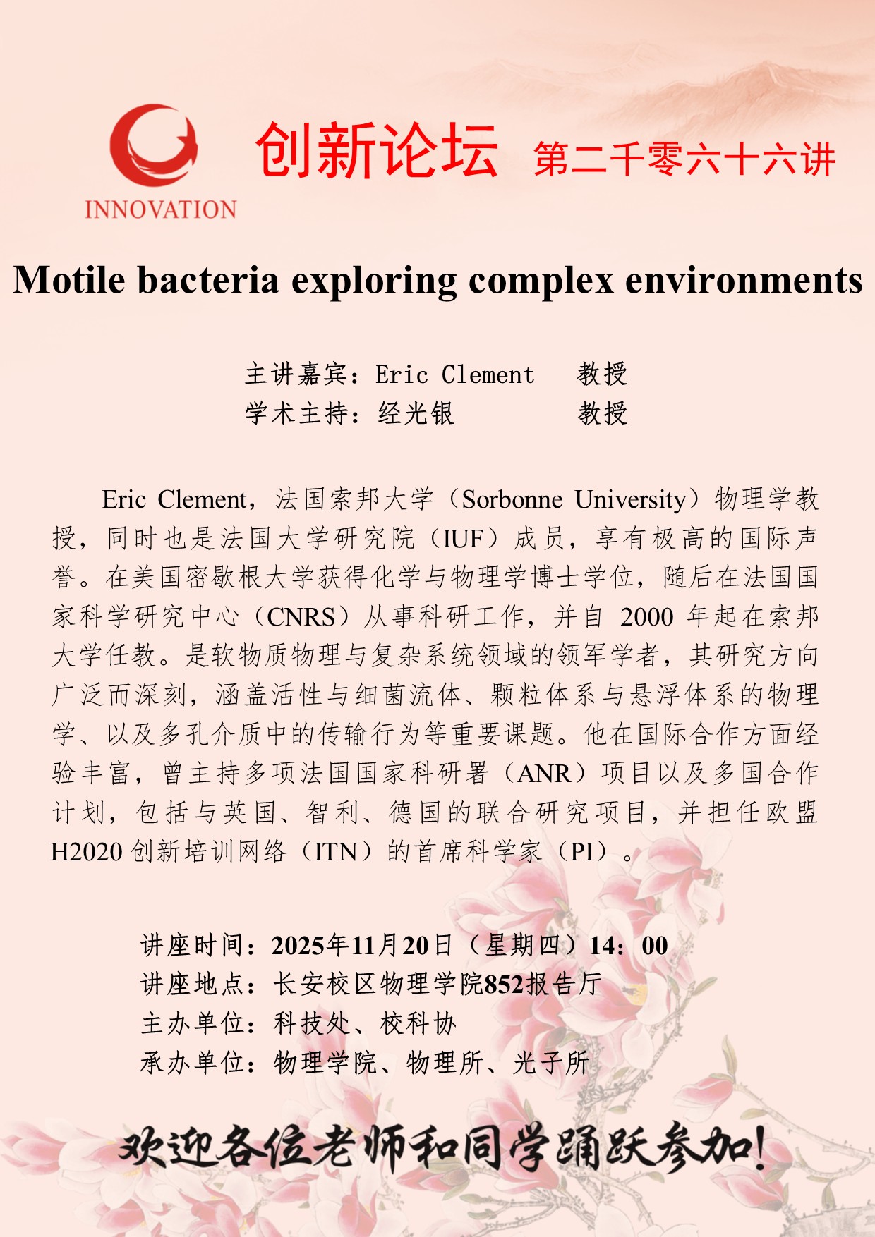 Eric Clement 教授 国产精品九九久久一区hh创新论坛第二千零六十六讲:Motile bacteria exploring complex environments 讲座时间 2025年11月20日(星期四)14:00 讲座地点 长安校区物理学院852报告厅 讲座人介绍 Eric Clement 教授 讲座内容