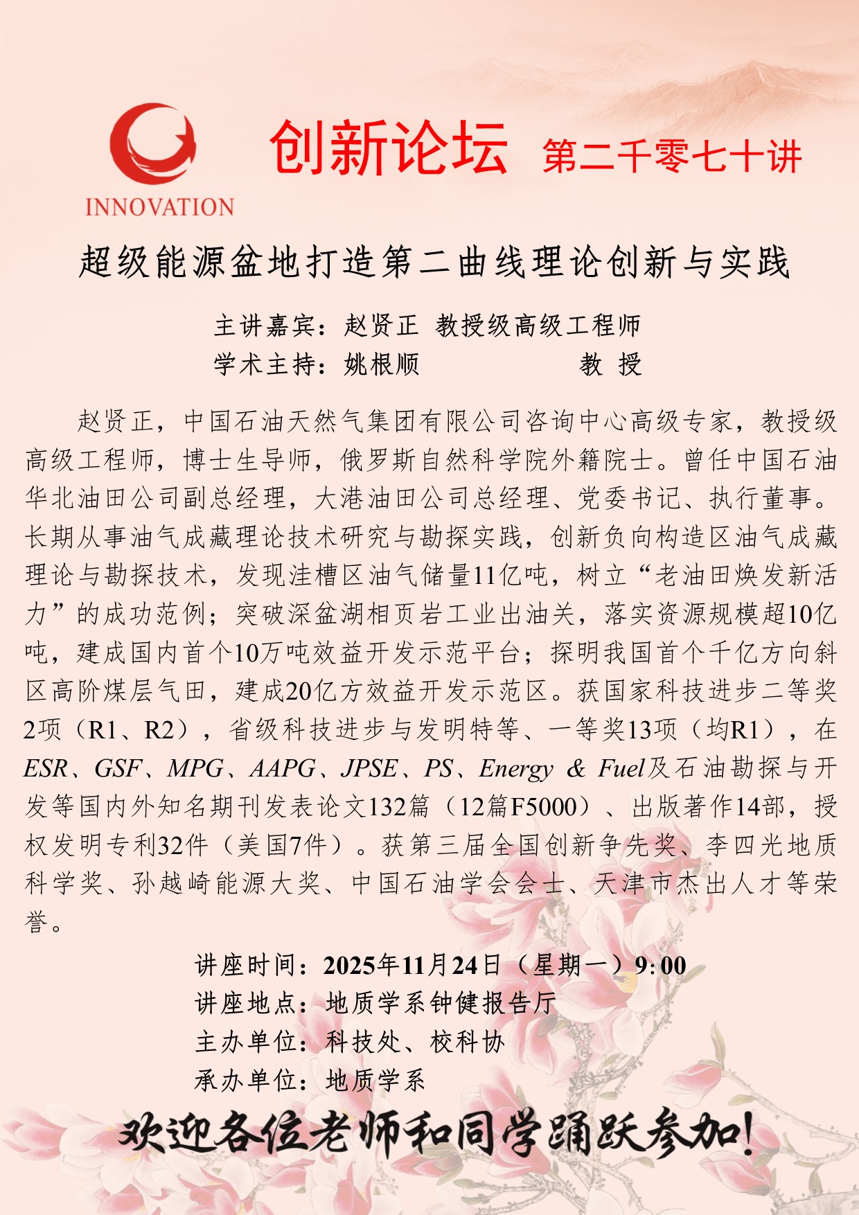 赵贤正 教授级高级工程师 国产精品九九久久一区hh创新论坛第二千零七十讲:超级能源盆地打造第二曲线理论创新与实践 讲座时间 2025年11月24日(星期一)9:00 讲座地点 地质学系钟健报告厅 讲座人介绍 赵贤正 教授级高级工程师 讲座内容