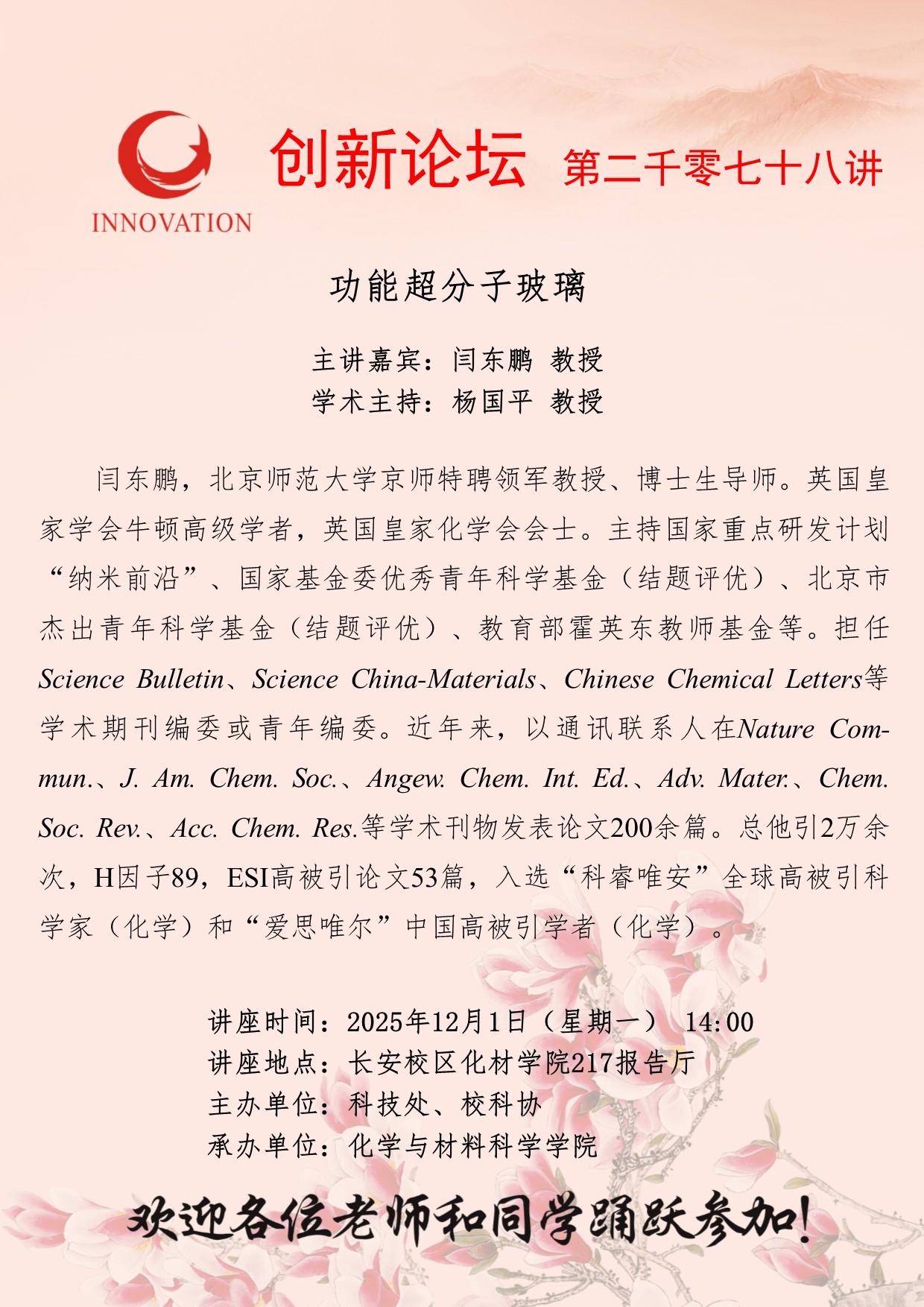 闫东鹏 教授 国产精品九九久久一区hh创新论坛第二千零七十八讲:功能超分子玻璃 讲座时间 2025年12月1日(星期一) 14:00 讲座地点 长安校区化材学院217报告厅 讲座人介绍 闫东鹏 教授 讲座内容