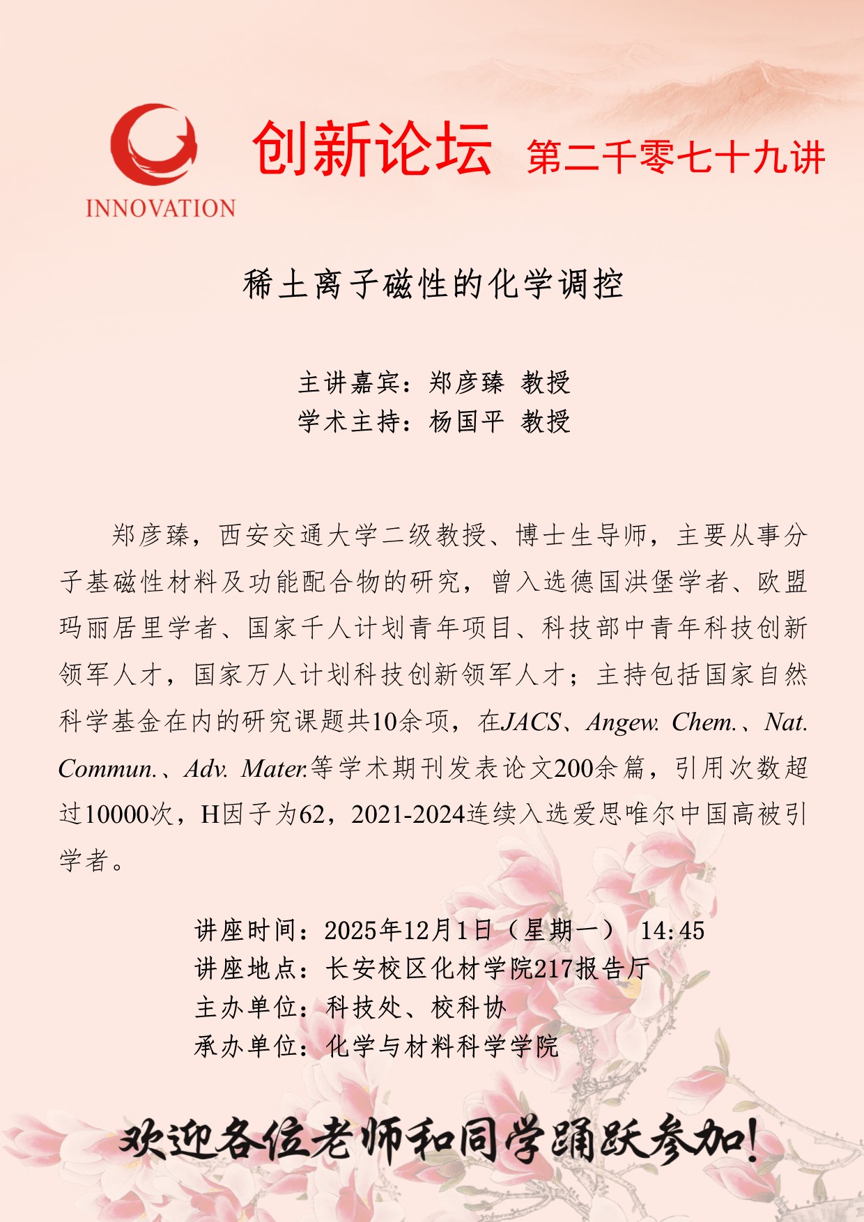 郑彦臻 教授 国产精品九九久久一区hh创新论坛第二千零七十九讲:稀土离子磁性的化学调控 讲座时间 2025年12月1日(星期一) 14:45 讲座地点 长安校区化材学院217报告厅 讲座人介绍 郑彦臻 教授 讲座内容