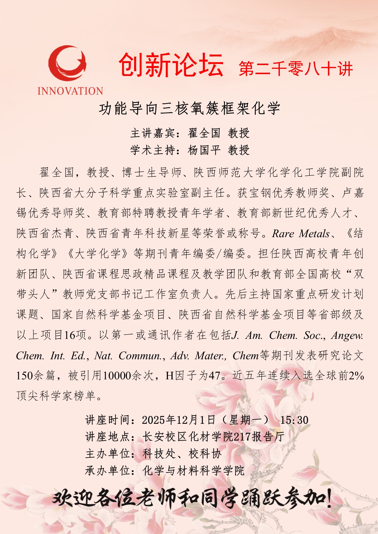 翟全国 教授 国产精品九九久久一区hh创新论坛第二千零八十讲:功能导向三核氧簇框架化学 讲座时间 2025年12月1日(星期一) 15:30 讲座地点 长安校区化材学院217报告厅 讲座人介绍 翟全国 教授 讲座内容