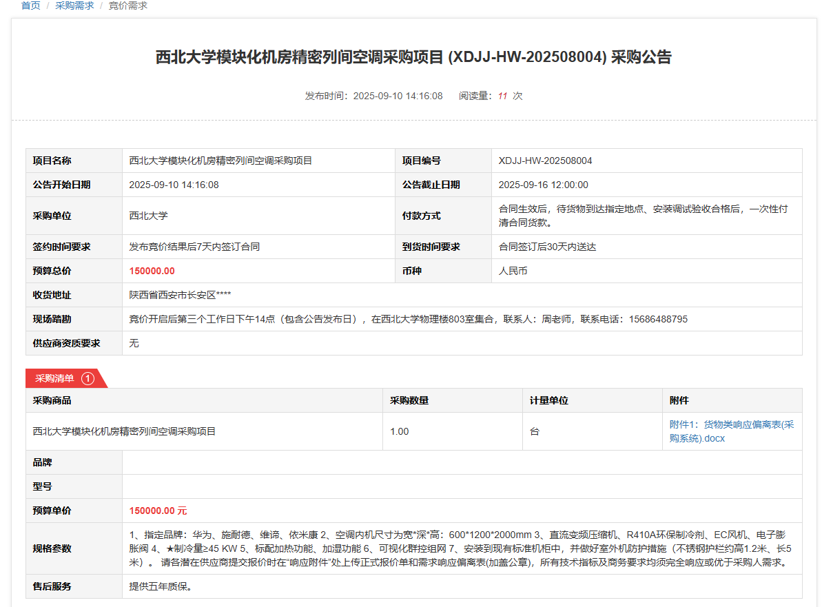 国产精品九九久久一区hh模块化机房精密列间空调采购项目(XDJJ-HW-202508004)竞价采购公告
