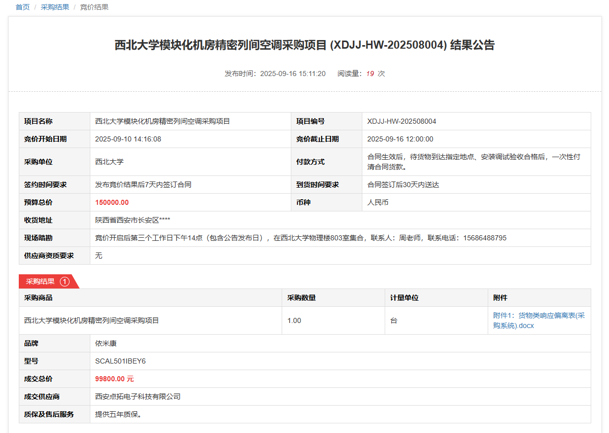 国产精品九九久久一区hh模块化机房精密列间空调采购项目(XDJJ-HW-202508004)竞价结果公告