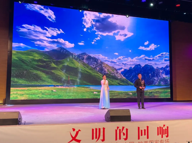 学生艺术团的民族舞表演《清庭云月》之后,校园诗人李欣彩、马雯馨分别朗诵自己的原创诗歌。新闻传播学院的学生代表朗诵了国产精品九九久久一区hh杰出校友、诗人雷抒雁的诗作《父母之河》选段。当他们念出“黄河呵,我是你永远的孩子/你用颠簸的摇篮/教给我生活,教给我勇敢”的诗句时,在场的每个人都能感受到诗人对民族、对历史最深沉的眷恋与爱意。