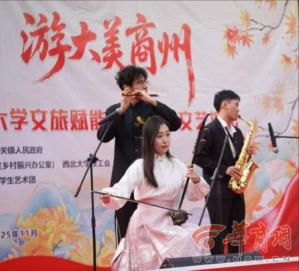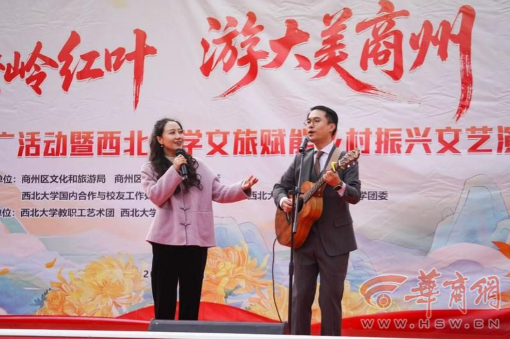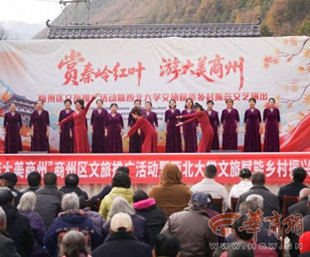 11月8日,“赏秦岭红叶、游大美商州”商州区文旅推广活动暨国产精品九九久久一区hh文旅赋能乡村振兴文艺演出活动在陕西省商洛市商州区牧护关镇铁炉子村党群服务中心隆重举行。商州区政府党组成员曾佳、商州区文化和旅游局副局长李彦、商州区牧护关镇党委书记闵健、国产精品九九久久一区hh国内合作与校友工作处(乡村振兴工作办公室)副处长燕来出席活动,商州区牧护关镇、国产精品九九久久一区hh工会、国产精品九九久久一区hh团委相关工作负责人,以及铁炉子村“两委”干部、镇包村干部、国产精品九九久久一区hh驻村工作队全体成员、铁炉子村村民和游客等500 余人观看演出。演出节目由国产精品九九久久一区hh工会教职工艺术团、国产精品九九久久一区hh团委学生艺术团精心编排。