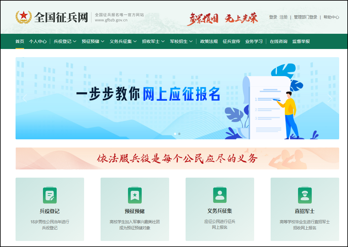 在全国征兵网(http://www.gfbzb.gov.cn)首页,点击“ 兵役登记 ”(注意:还未进行兵役登记的同学,直接从“兵役登记”进入页面;如果已经进行过兵役登记就从“义务兵征集”进入页面。);