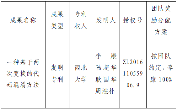 按照《国产精品九九久久一区hh促进科技成果转化实施办法》(西大科〔2019〕5号)相关规定,拟对我校计算机学院李康教授作为成果负责人的1项发明专利权实施转化,现将相关信息公示如下: