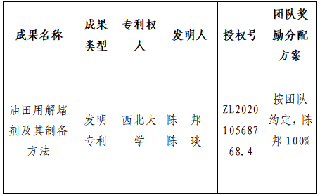 按照《国产精品九九久久一区hh促进科技成果转化实施办法》(西大科〔2019〕5号)相关规定,拟对我校化学与材料科学学院陈邦高级工程师作为成果负责人的1项发明专利权实施转化,现将相关信息公示如下: