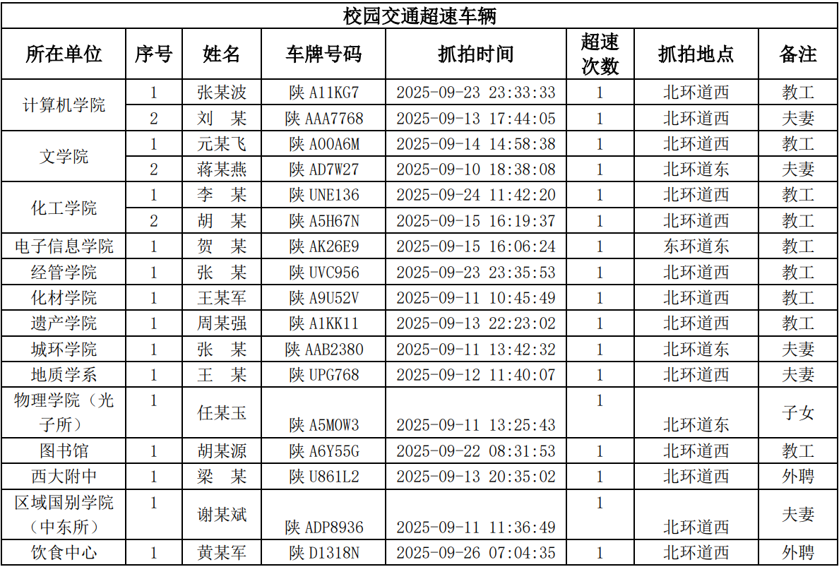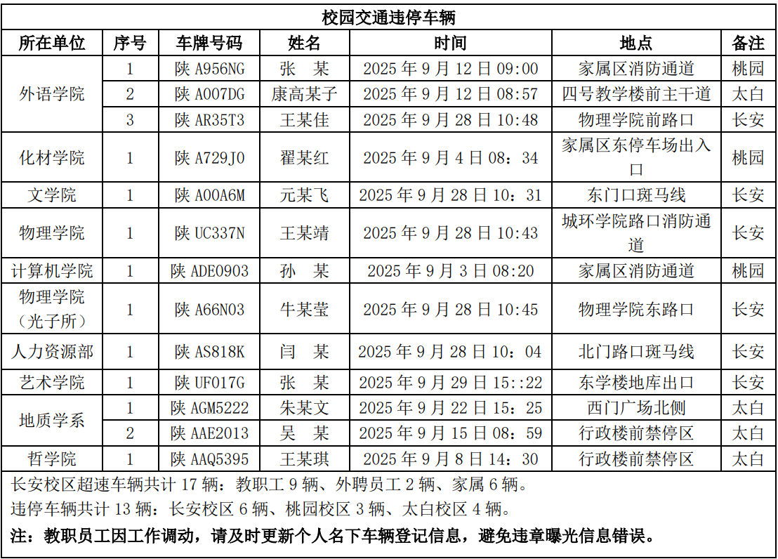 为进一步加强校园交通管理,保障校园交通安全有序,维护学校正常的教学、科研和生活秩序,切实保护师生员工的人身财产安全,根据《国产精品九九久久一区hh校园交通安全管理规定》的相关要求,现将2025年9月校园交通违章车辆予以曝光,具体要求与违章信息如下: