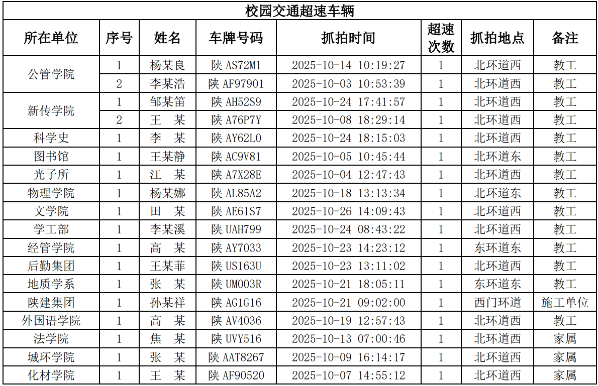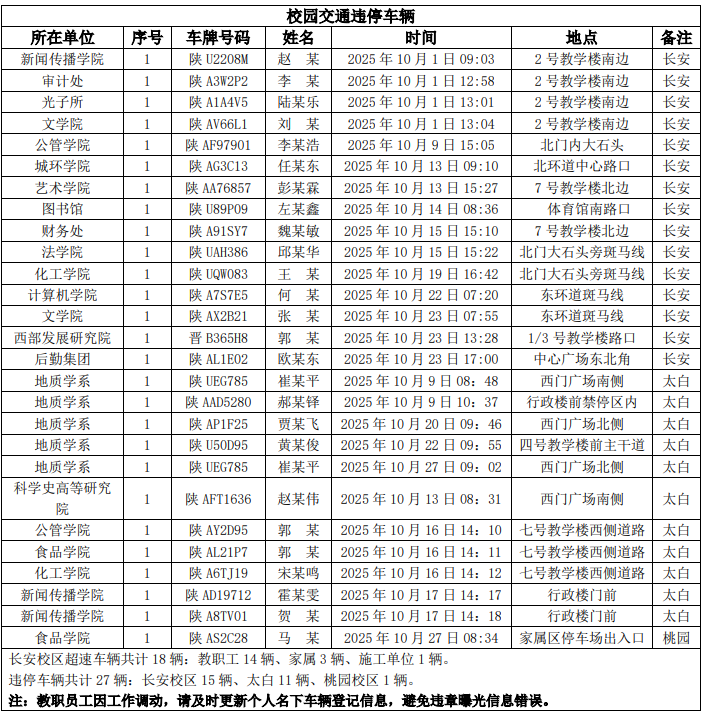 为进一步加强校园交通管理,保障校园交通安全有序,维护学校正常的教学、科研和生活秩序,切实保护师生员工的人身财产安全,根据《国产精品九九久久一区hh校园交通安全管理规定》的相关要求,现将2025年10月校园交通违章车辆予以曝光,具体要求与违章信息如下: