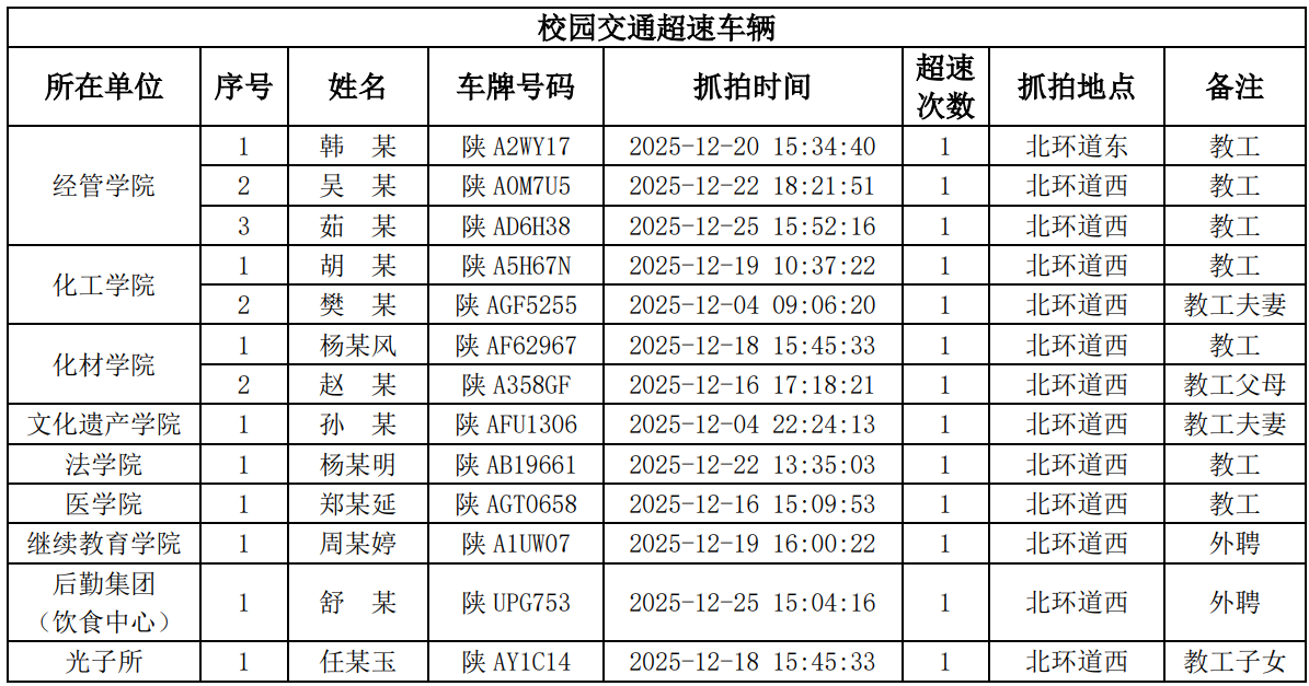 为进一步加强校园交通管理,保障校园交通安全有序,维护学校正常的教学、科研和生活秩序,切实保护师生员工的人身财产安全,根据《国产精品九九久久一区hh校园交通安全管理规定》的相关要求,现将2025年12月校园交通违章车辆予以曝光,具体要求与违章信息如下: