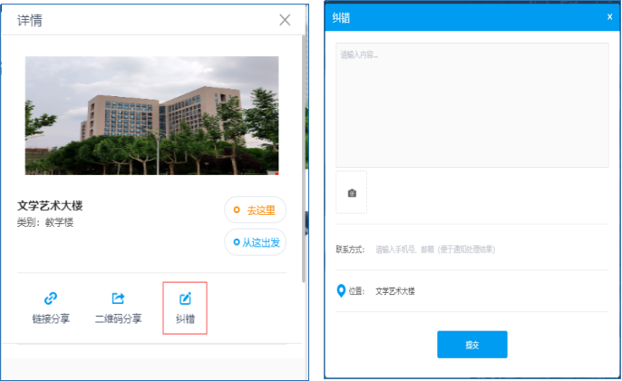 三、在线纠错。使用时如发现错误,可点击数据出错的楼宇或单位,在弹出的页面(图一)点击“纠错”链接后,对话框中(图二)填写出错信息。亦可截取出错网页图像,标注出错地理位置信息后,发送邮件到[email protected]。