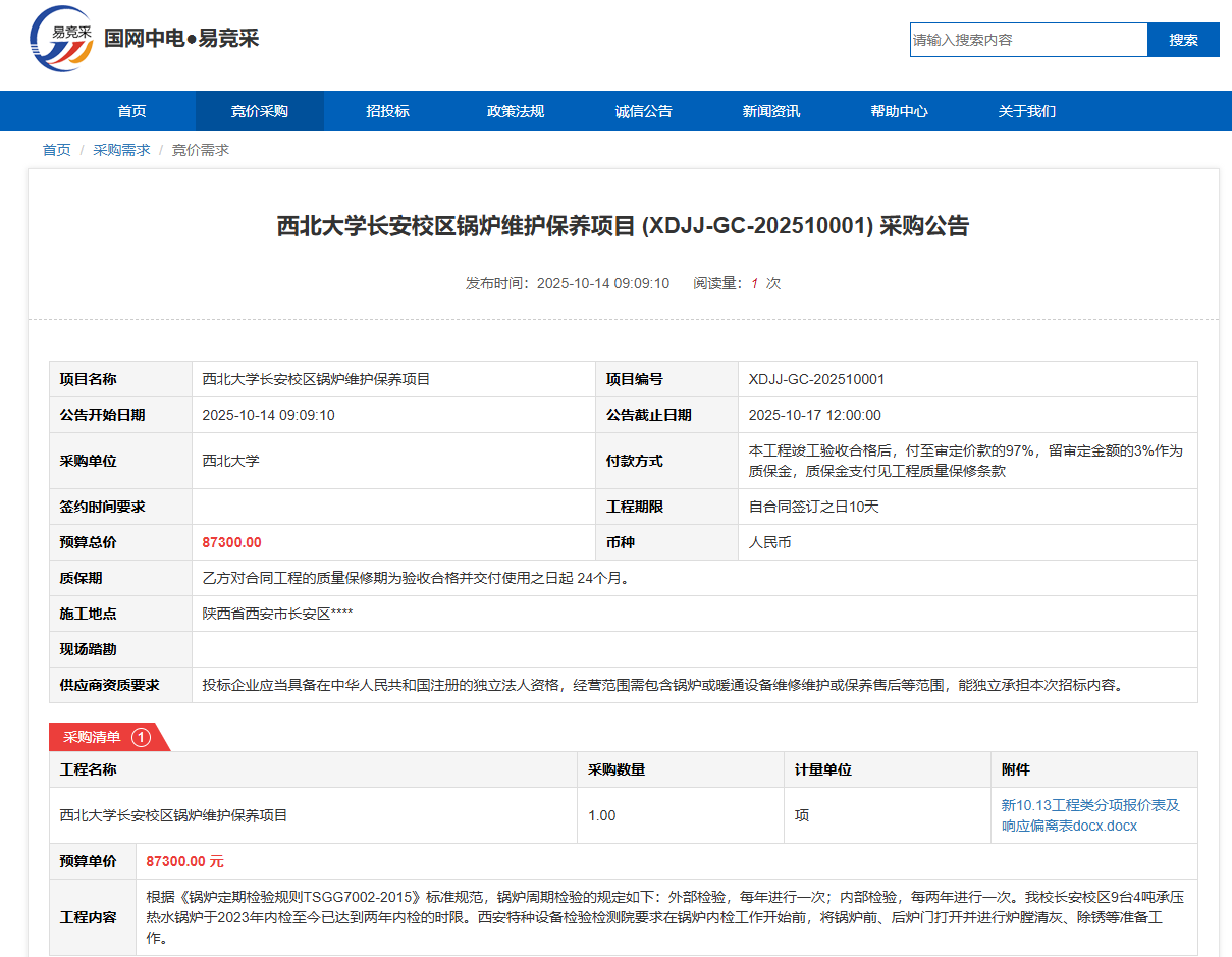 国产精品九九久久一区hh长安校区锅炉维护保养项目(XDJJ-GC-202510001)竞价采购公告