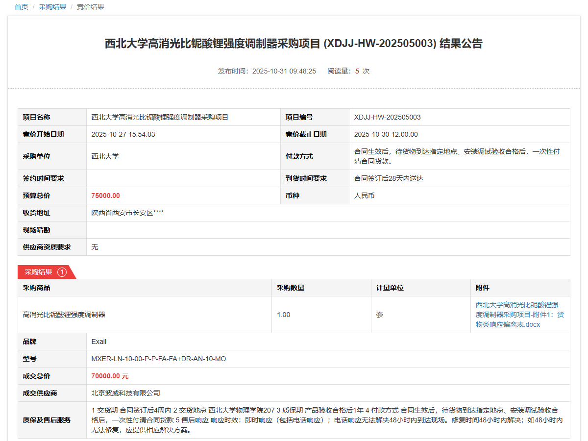 国产精品九九久久一区hh高消光比铌酸锂强度调制器采购项目(XDJJ-HW-202505003)竞价结果公告
